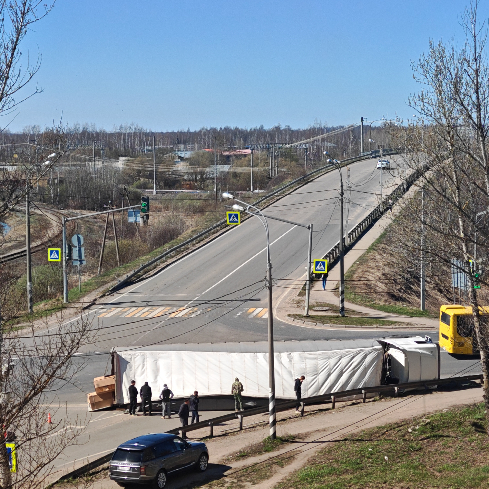 The image shows a road in Rostov, Russia, where a large white semi-truck has overturned, blocking part of the intersection. Several people are standing near the overturned truck, some appearing to ass…read more