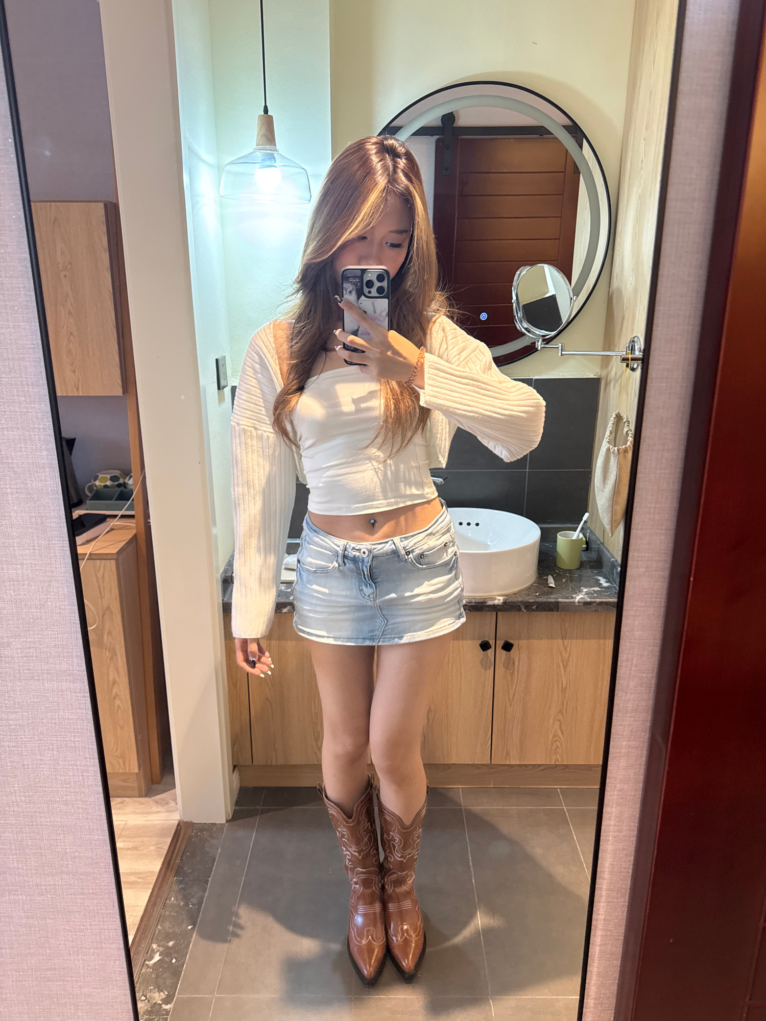 A young woman is captured in a full-body mirror selfie taken in what appears to be a modern bathroom, likely in Jiayuguan, China. She is positioned centrally in the large rectangular mirror, holding an iPhone with a distinctive black and white patterned case up to obscure most of her face. The woman is dressed in a fitted white long-sleeved crop top, revealing her midriff and a silver belly button piercing. She pairs this with a light blue denim mini-skirt and eye-catching brown cowboy boots adorned with white embroidered patterns. Her long, straight brown hair, with lighter streaks, falls over her shoulders. Her nails are painted white, and a subtle bracelet is visible on her left wrist. The bathroom setting includes a modern circular mirror with an illuminated LED light ring and an attached smaller, adjustable magnifying mirror. Below it, a white circular sink sits on a dark, possibly marble-patterned countertop. Wooden vanity cabinets with black square handles are visible below the sink area. The walls behind the sink are a mix of light grey and darker tiles, while the floor consists of large light grey square tiles. Reflected in the circular mirror is a wooden door. To the left, a clear glass pendant light with a wooden top hangs from the ceiling, casting a bright glow. A green toothbrush holder with a toothbrush and a small light-colored pouch are also on the counter. There is no visible text in the image. | Open Wire