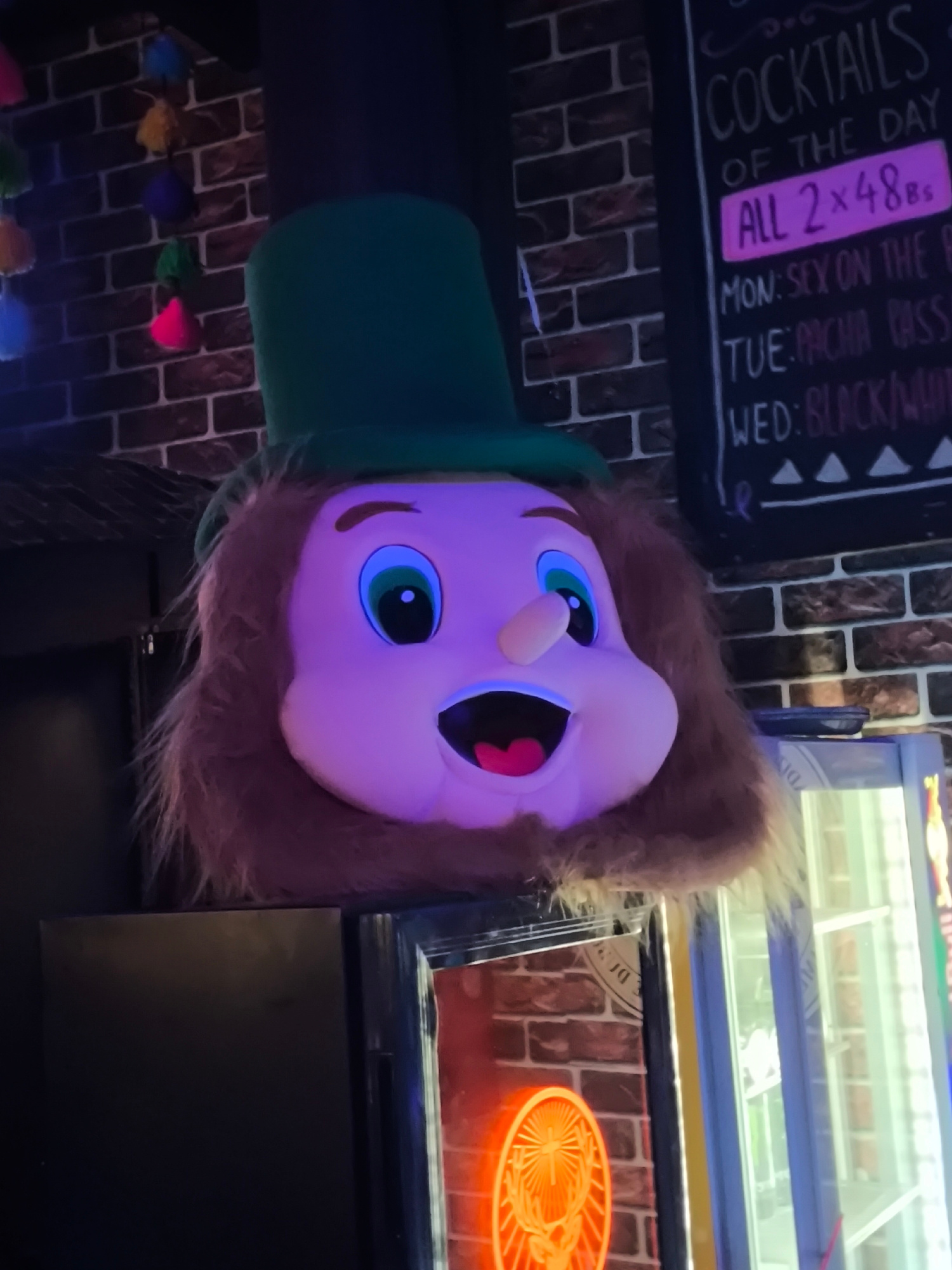 The image displays an indoor scene within a bar or pub, illuminated by dim, purplish light. A large, plush mascot head dominates the center, featuring a green top hat, light purple facial skin, large…read more
