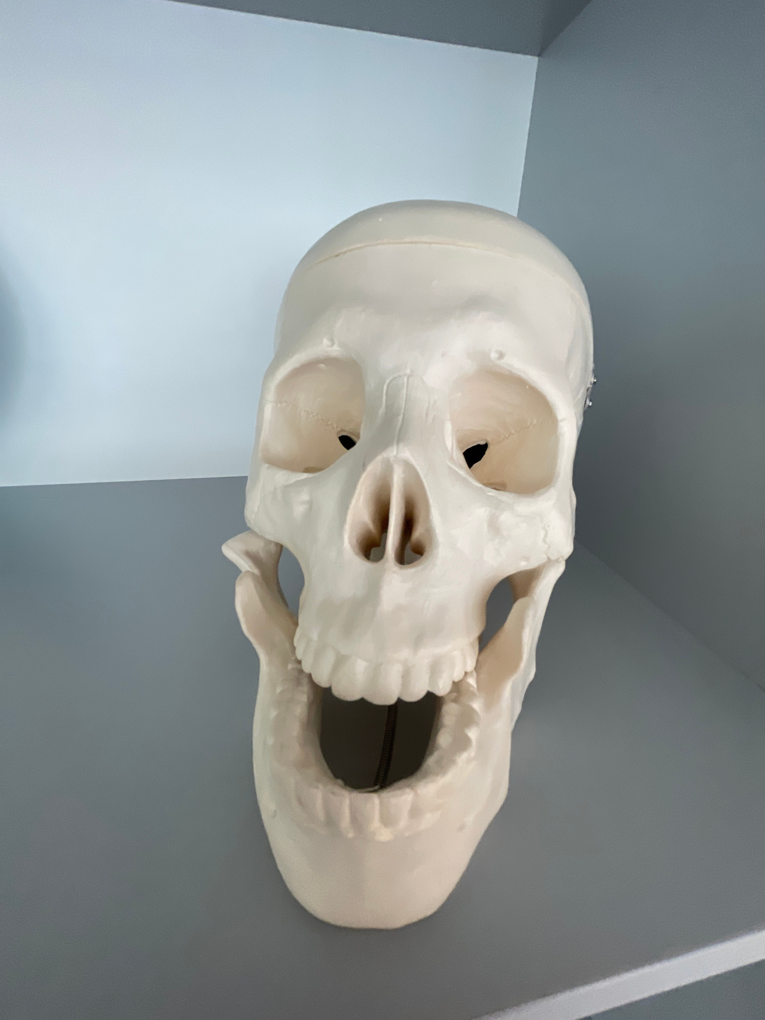 A plastic human skull rests on a light gray surface. The background is light gray walls meeting in a corner. The location is not discernible from the image.