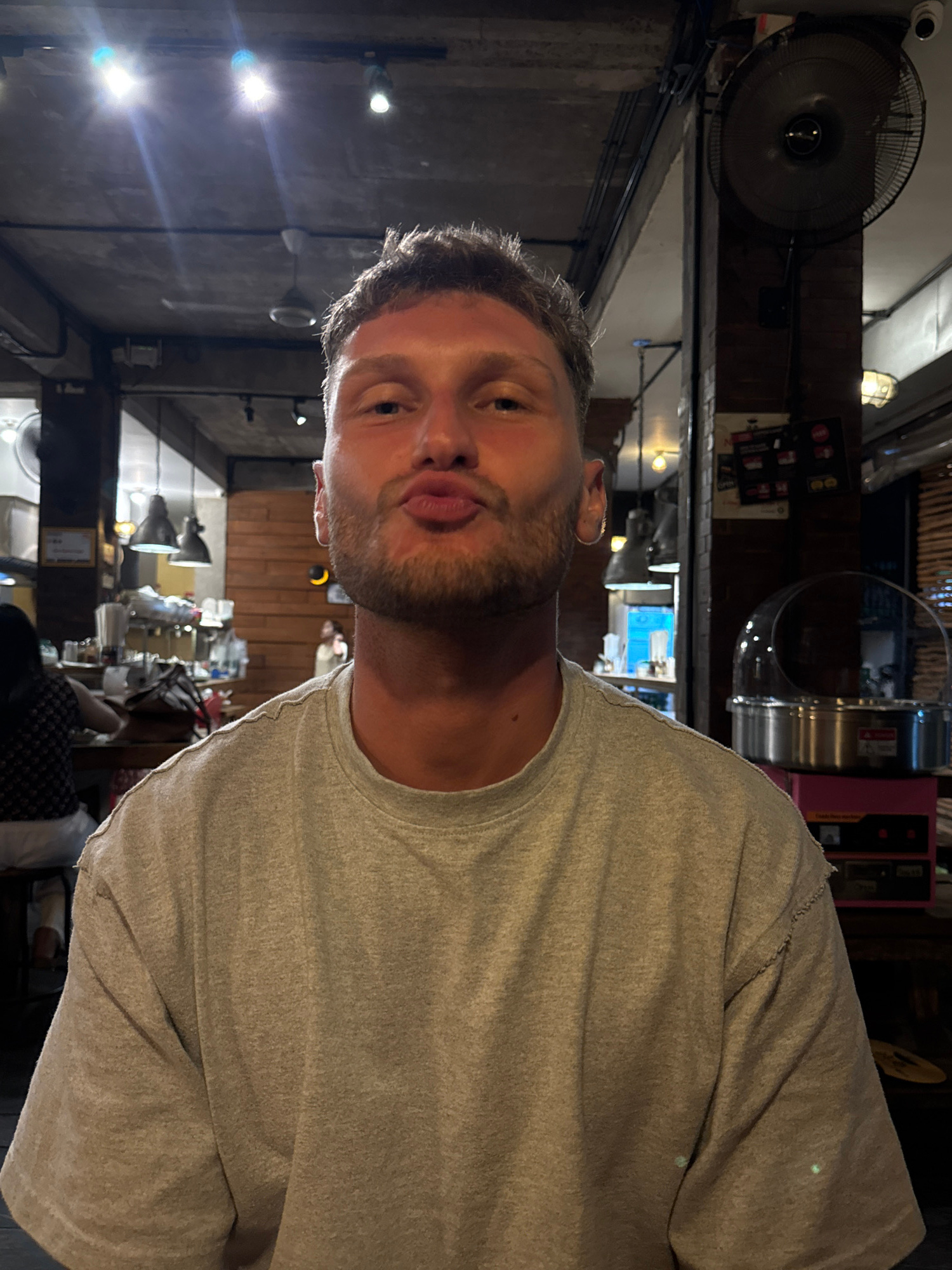 A man with short, light-colored hair and a beard is indoors, wearing a gray t-shirt. He is positioned at a slight angle, with the left side of his face closer to the camera. He is making a kissing fac…read more