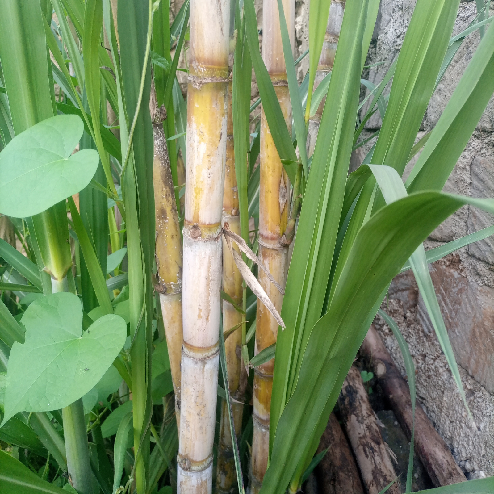 The scene, identified as Kimorori/Wempa ward, Kenya, depicts a close-up of dense vegetation. Multiple mature sugarcane stalks, predominantly yellow-white to tan in color with distinct nodes and remnan…read more
