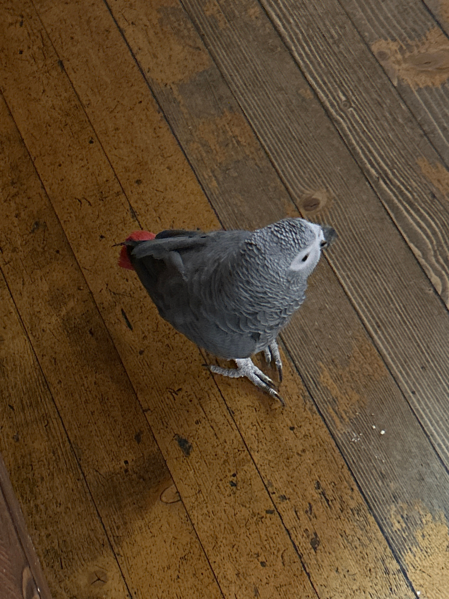 A gray parrot with a red tail feather is perched on a wooden surface, possibly a floor or wall. The wood has a light brown, textured grain. The parrot is facing upwards with its head tilted back. The…read more