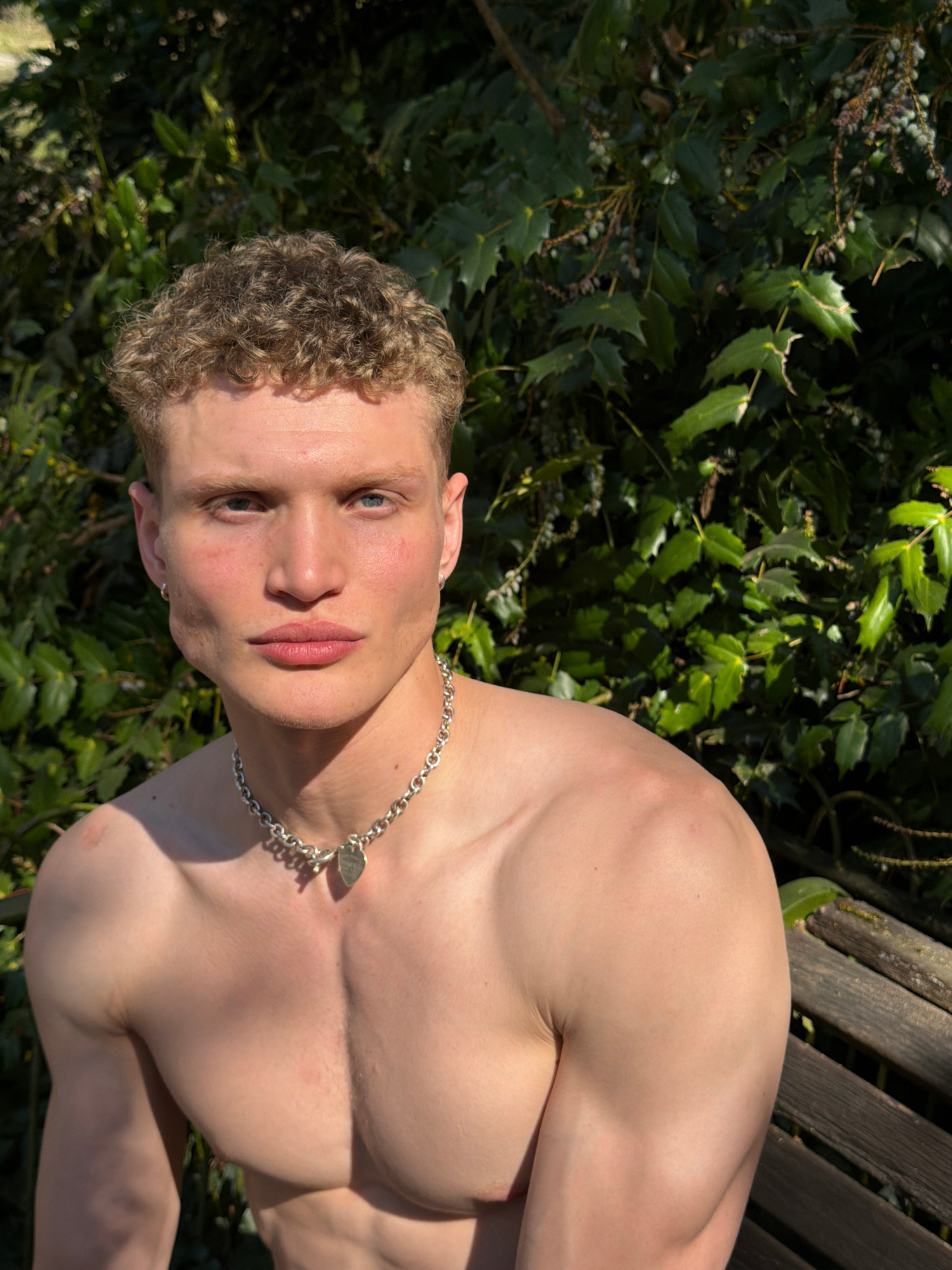 A shirtless, fair-skinned man with curly blond hair poses outdoors. He is wearing a silver necklace with a heart-shaped pendant. He is positioned against a backdrop of dense green foliage and a wooden…read more