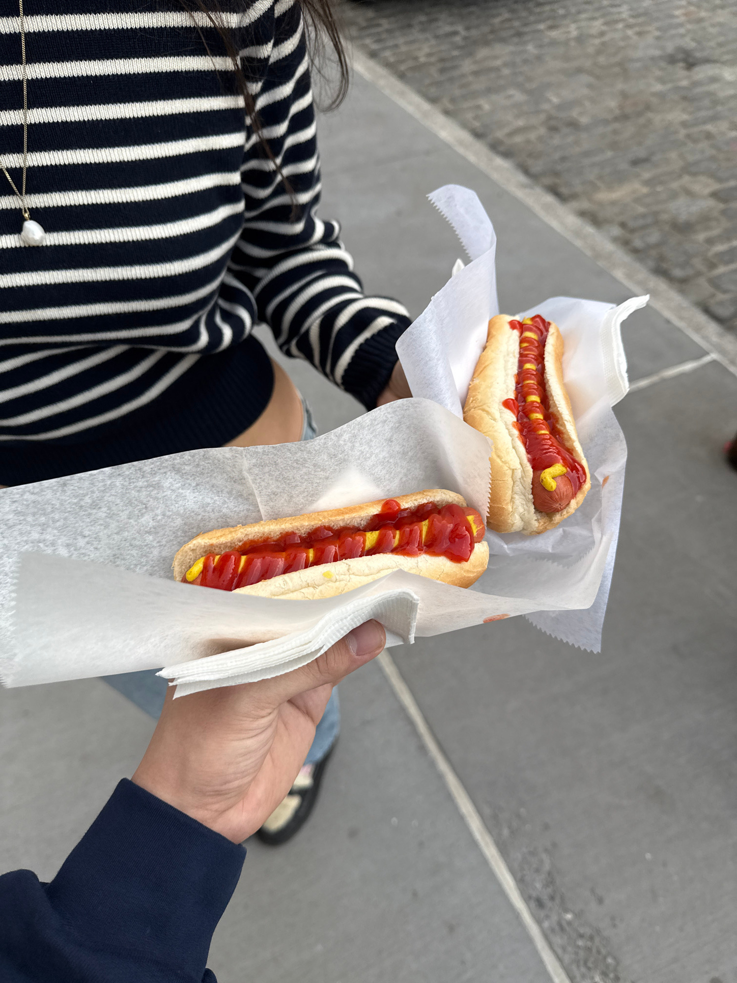 The image captures two hot dogs held in hand, with one person wearing a striped sweater and another wearing a blue jacket. Both hot dogs are on paper towels and are topped with mustard and ketchup. Th…read more