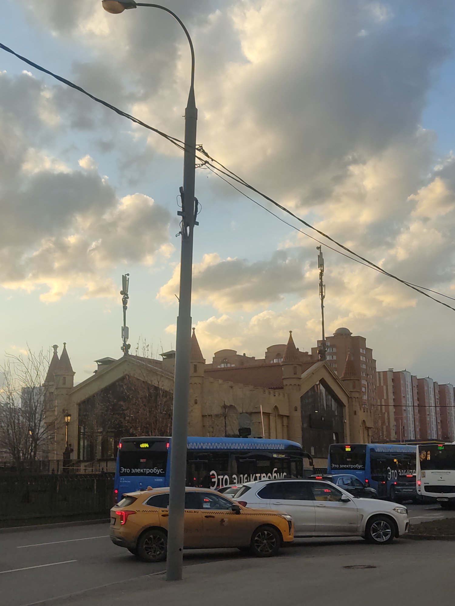 The image shows a street in Moscow, Russia, with buses and cars lined up on the right side of the road. The buses have the Russian words "Это электробус" on them, indicating they are electric buses. A…read more