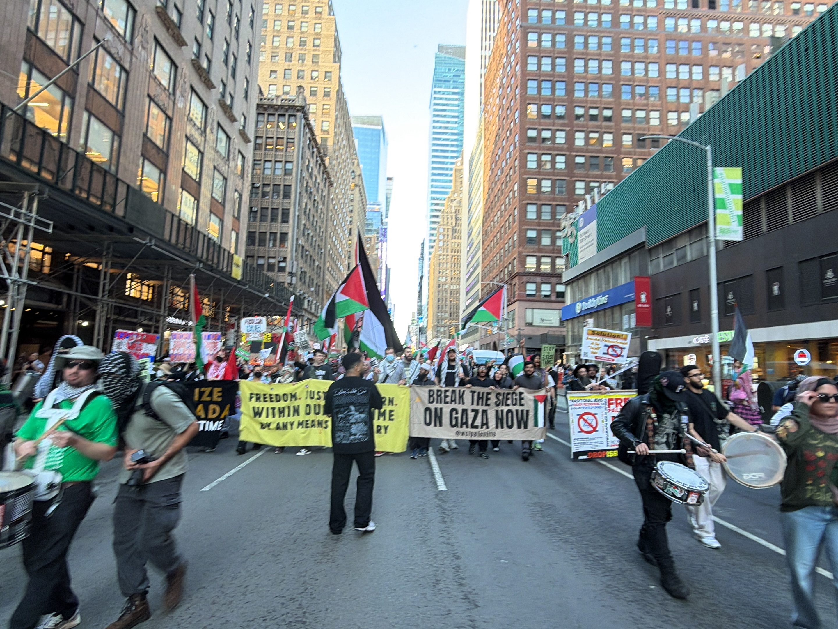 A crowd of people march in a demonstration along a street in New York City. The street is lined with tall buildings. The demonstrators carry Palestinian flags and banners with slogans "FREEDOM JUST WI…read more