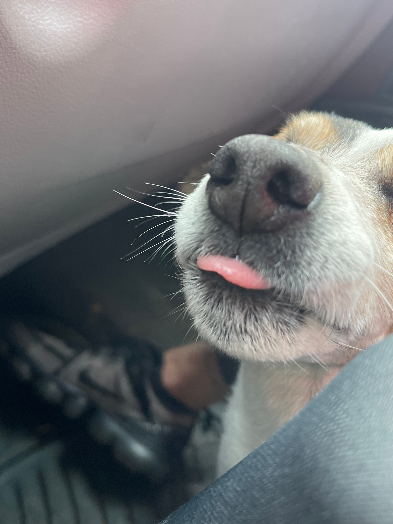 A close-up photograph depicts the snout of a dog, likely inside a vehicle. The dog's nose is prominent and wet, with a small pink tongue protruding slightly from its mouth. The dog has grey and white…read more