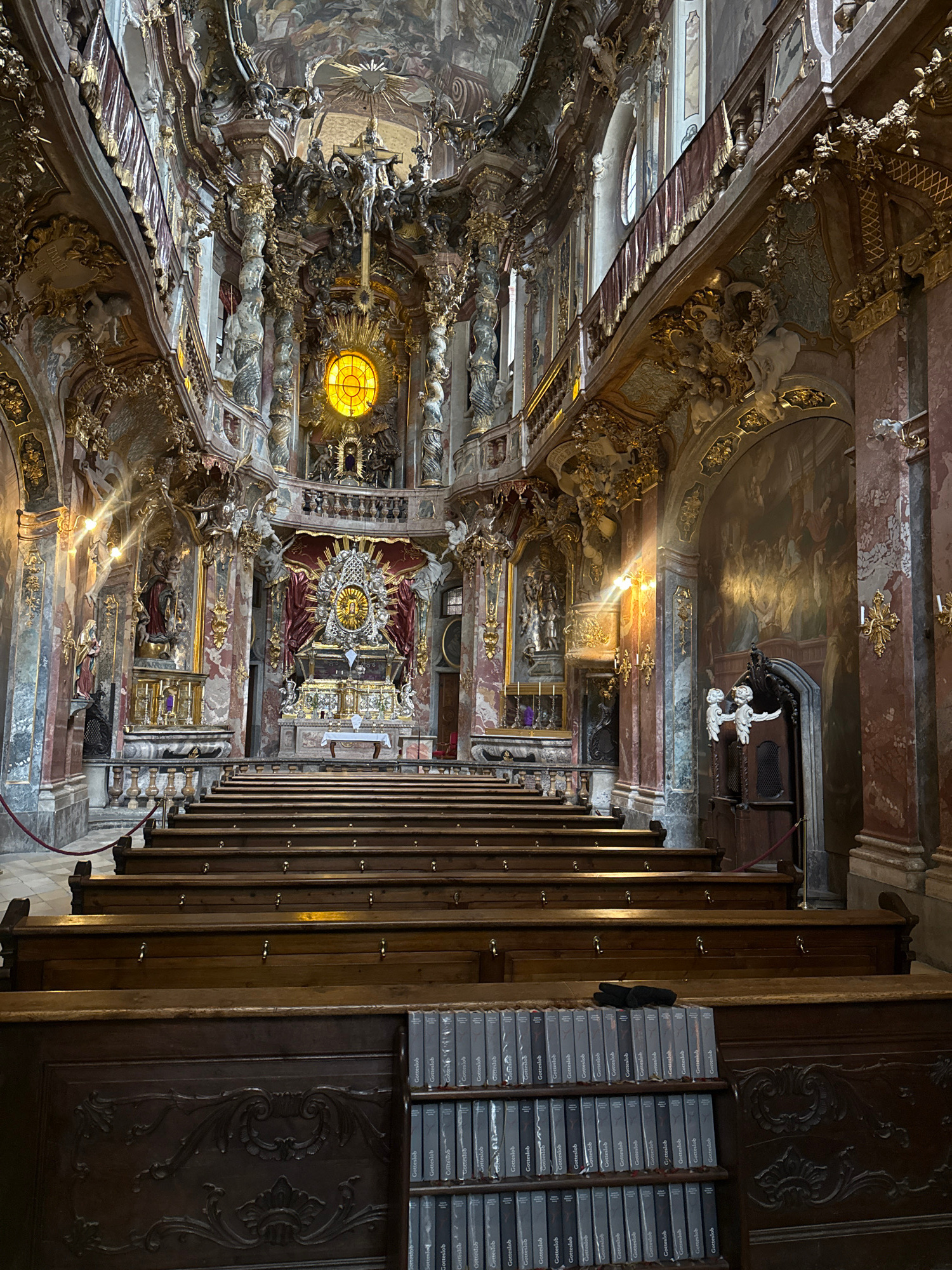 The image shows the interior of the Asam Church in Munich, Germany, taken from a low perspective, looking upwards and slightly to the side. The church is highly ornate, with intricate gold detailing,…read more