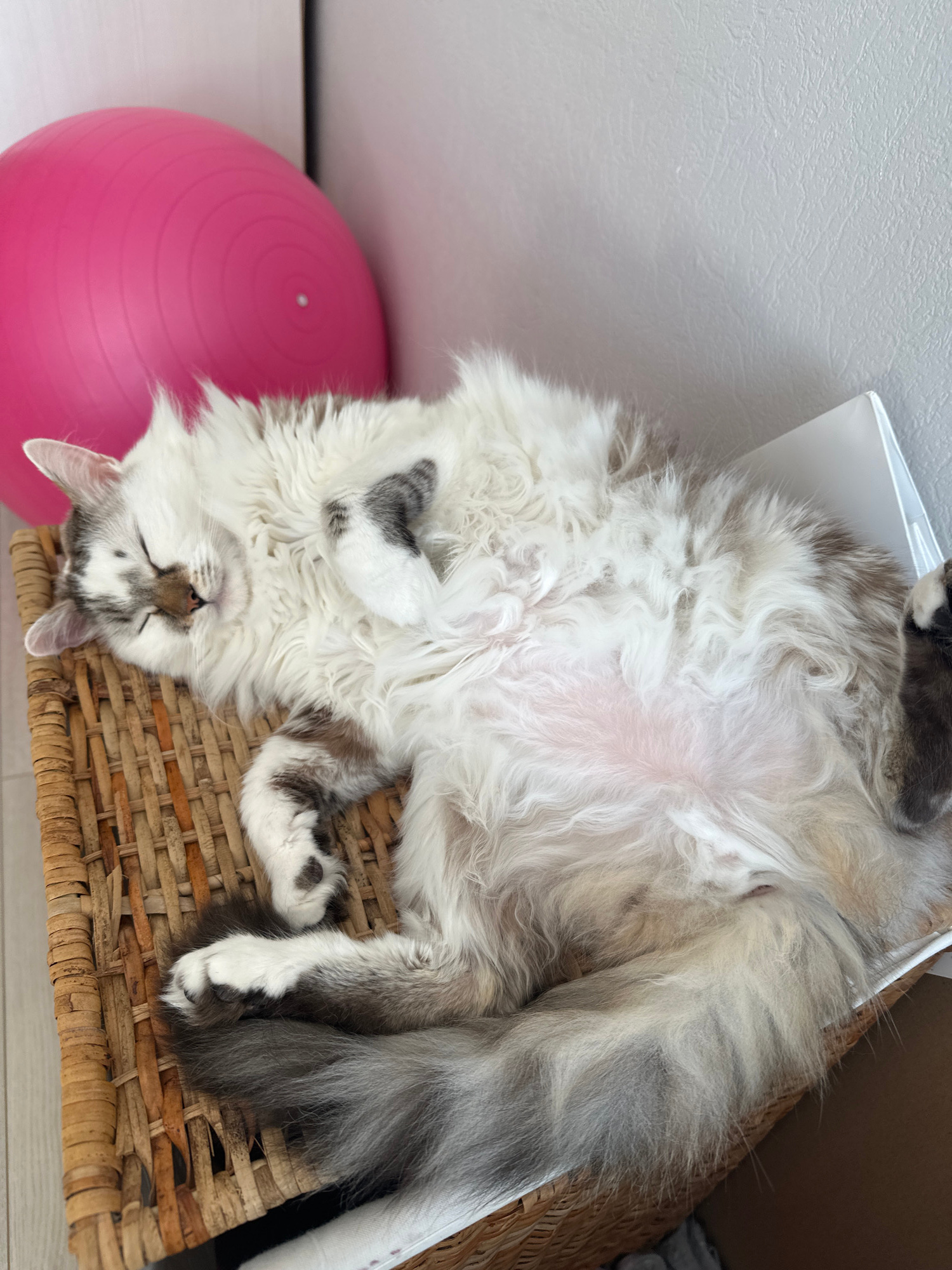 One long-haired domestic cat is observed sleeping on its back on a light brown wicker furniture piece within an indoor residential setting in Khimki, Russia. The cat exhibits predominantly white fur w…read more