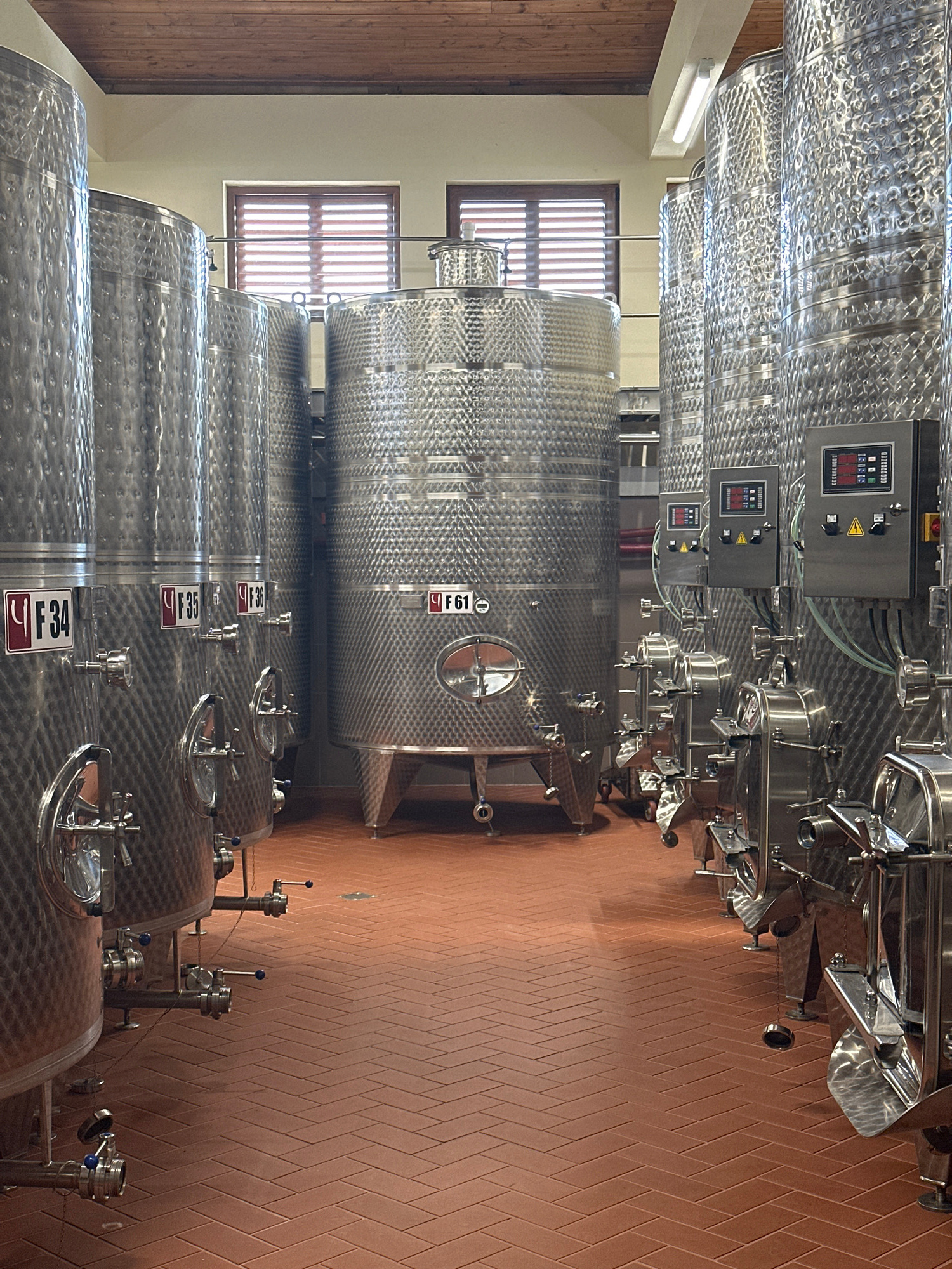 The image depicts the interior of a winery located in Chernovrah, Bulgaria, featuring several large stainless steel fermentation tanks arranged in rows. The tanks have textured surfaces and are labele…read more
