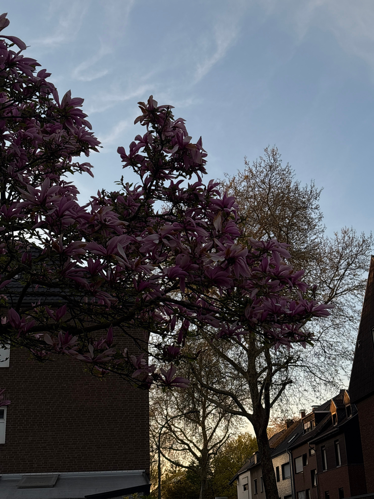 A low-angle shot captures a magnolia tree with dark pink blossoms, in contrast with a mostly bare tree. The sky is partly cloudy. In the background are brick buildings, situated in Mönchengladbach, Ge…read more