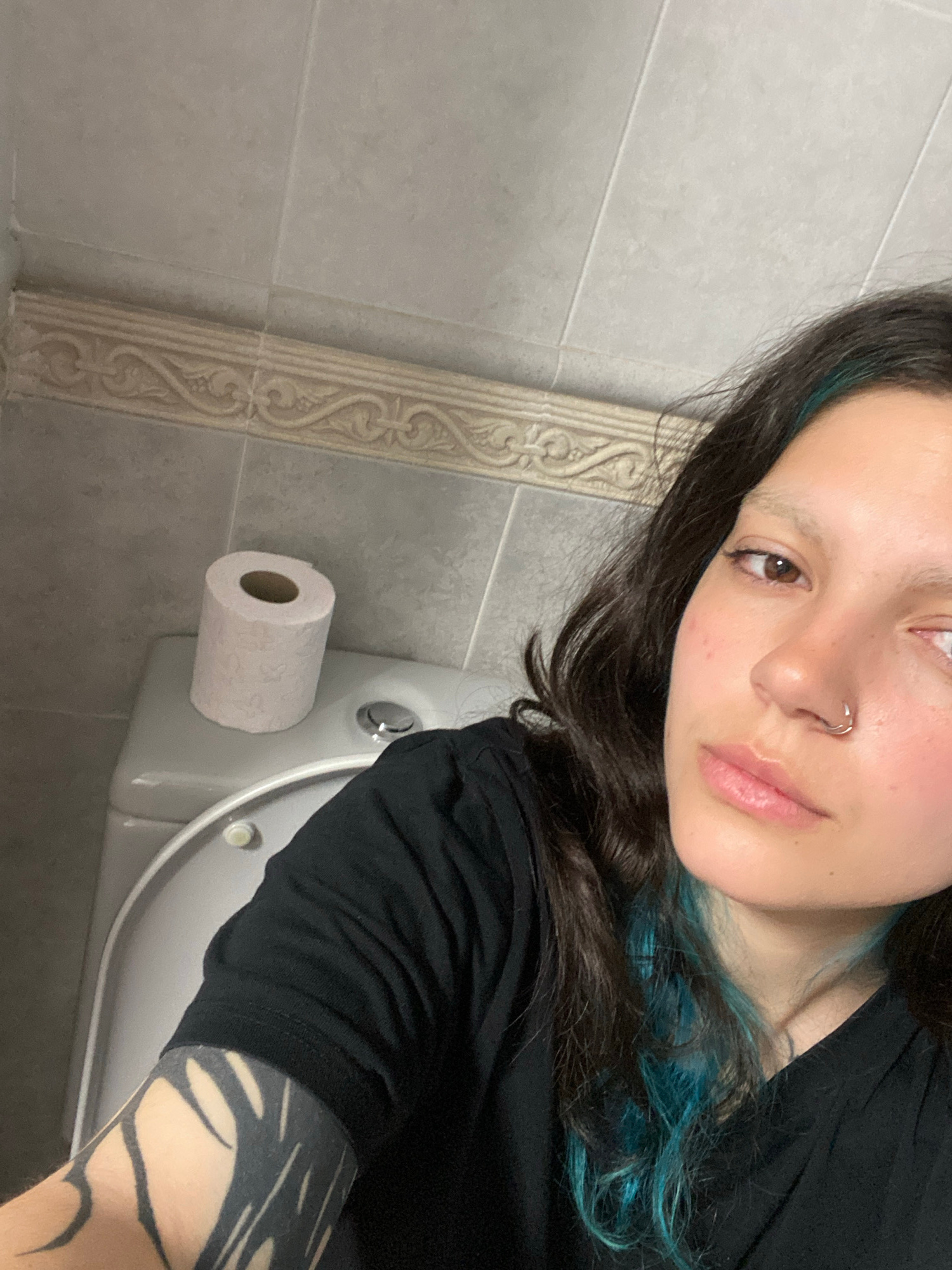 A selfie taken indoors, likely in a bathroom. A young woman with brown hair (with streaks of teal blue) is in the foreground. She has fair skin, brown eyes, and a nose ring. She's wearing a black shir…read more