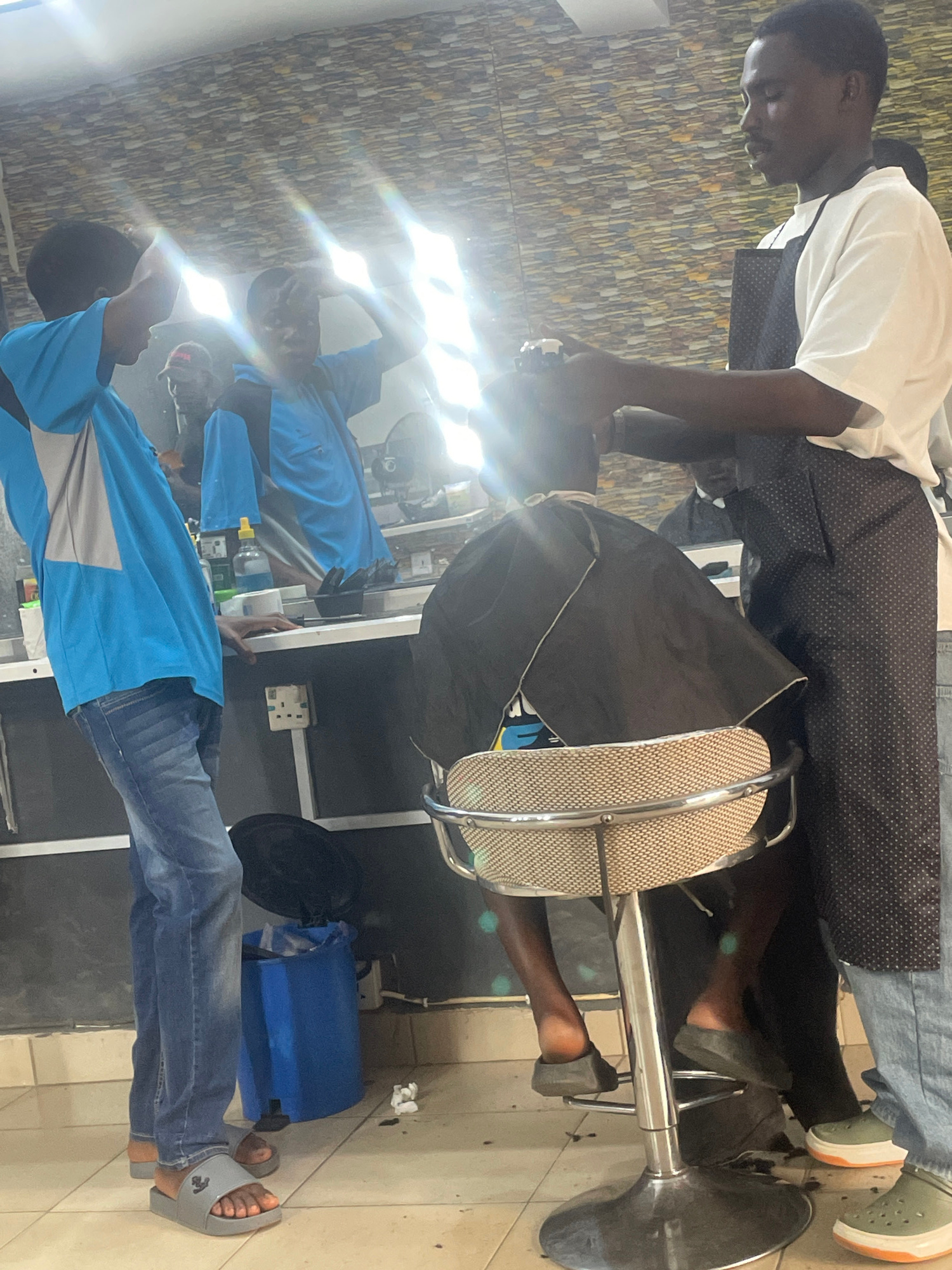 A barber is giving a haircut to a client in a shop. The barber is wearing a white shirt and black apron. The client is seated in a barber's chair, draped with a black cape. Other individuals are prese…read more