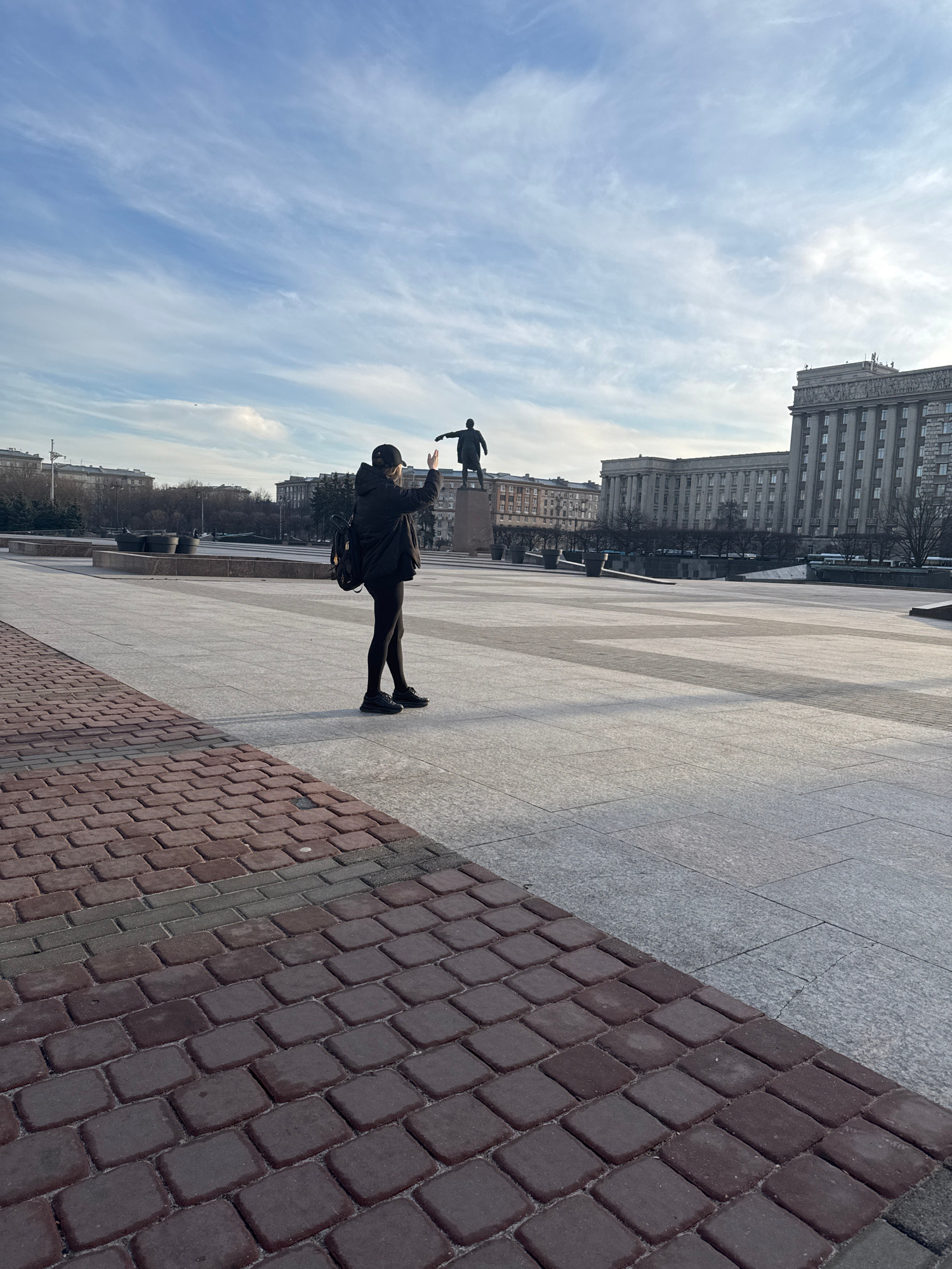 An eye-level photograph, oriented sideways, shows a figure standing near a statue in an urban setting. The figure, dressed in a dark-colored outfit, stands with one arm raised, appearing to interact w…read more