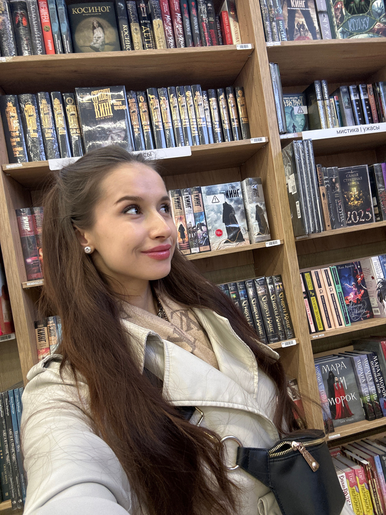 A young woman is looking up and leftward, seemingly at books on wooden shelves in a bookstore, possibly in Yekaterinburg, Russia, based on Cyrillic text on the books. Her right ear has a visible studβ¦read more