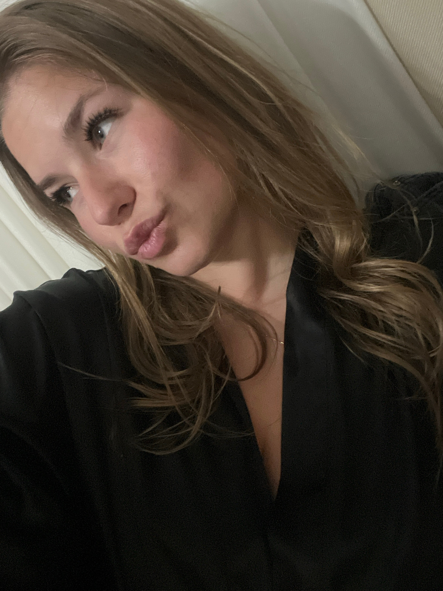 A woman with light brown hair is seen in a close-up shot. She has fair skin, light eyes, and full lips. She is wearing a black top. The background appears to be a white surface, possibly a bed or a co…read more