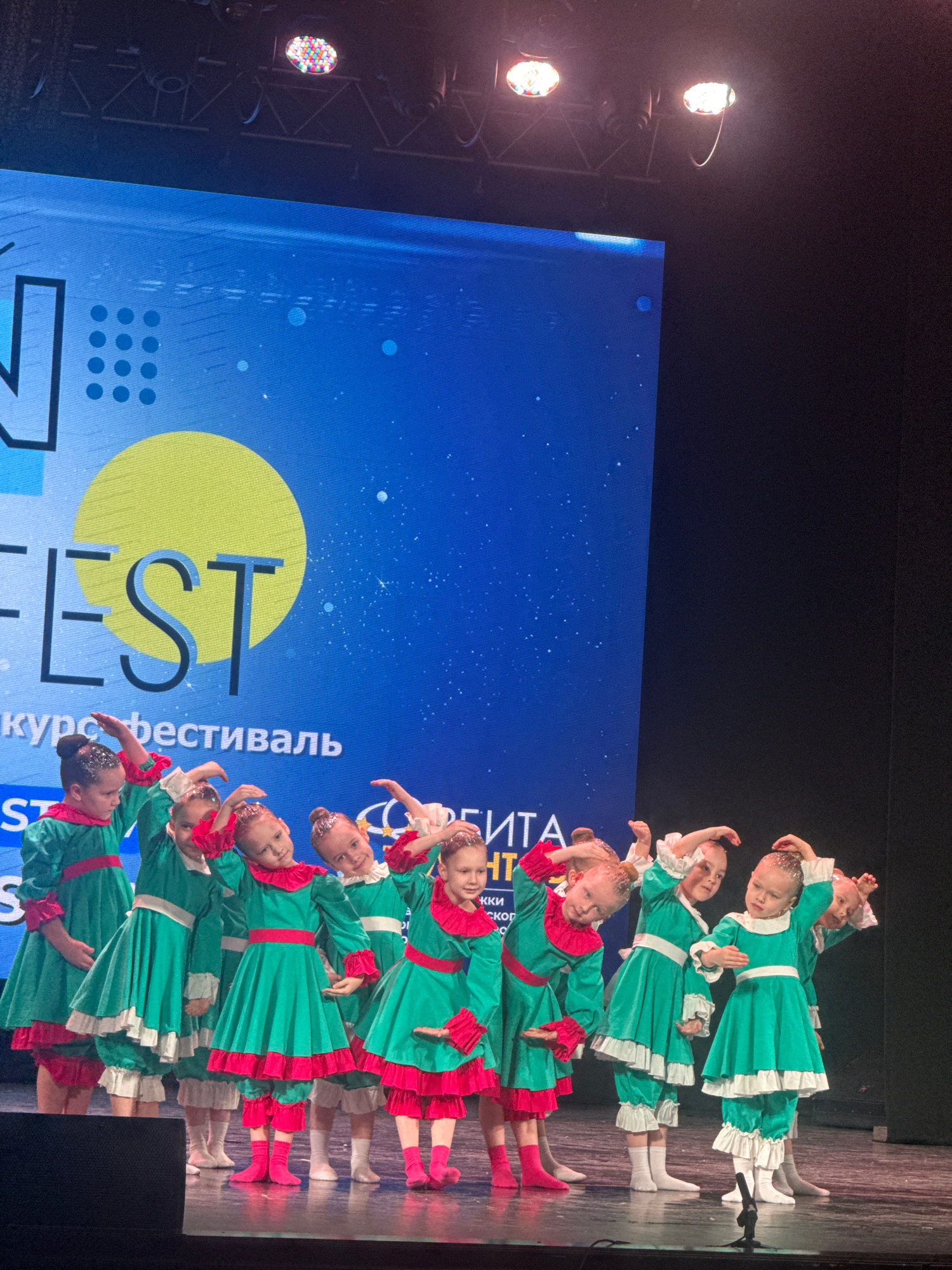 The image depicts a group of young girls performing a dance routine on a stage. They are dressed in matching green costumes with red or white ruffles and wearing matching socks. They appear to be in t…read more