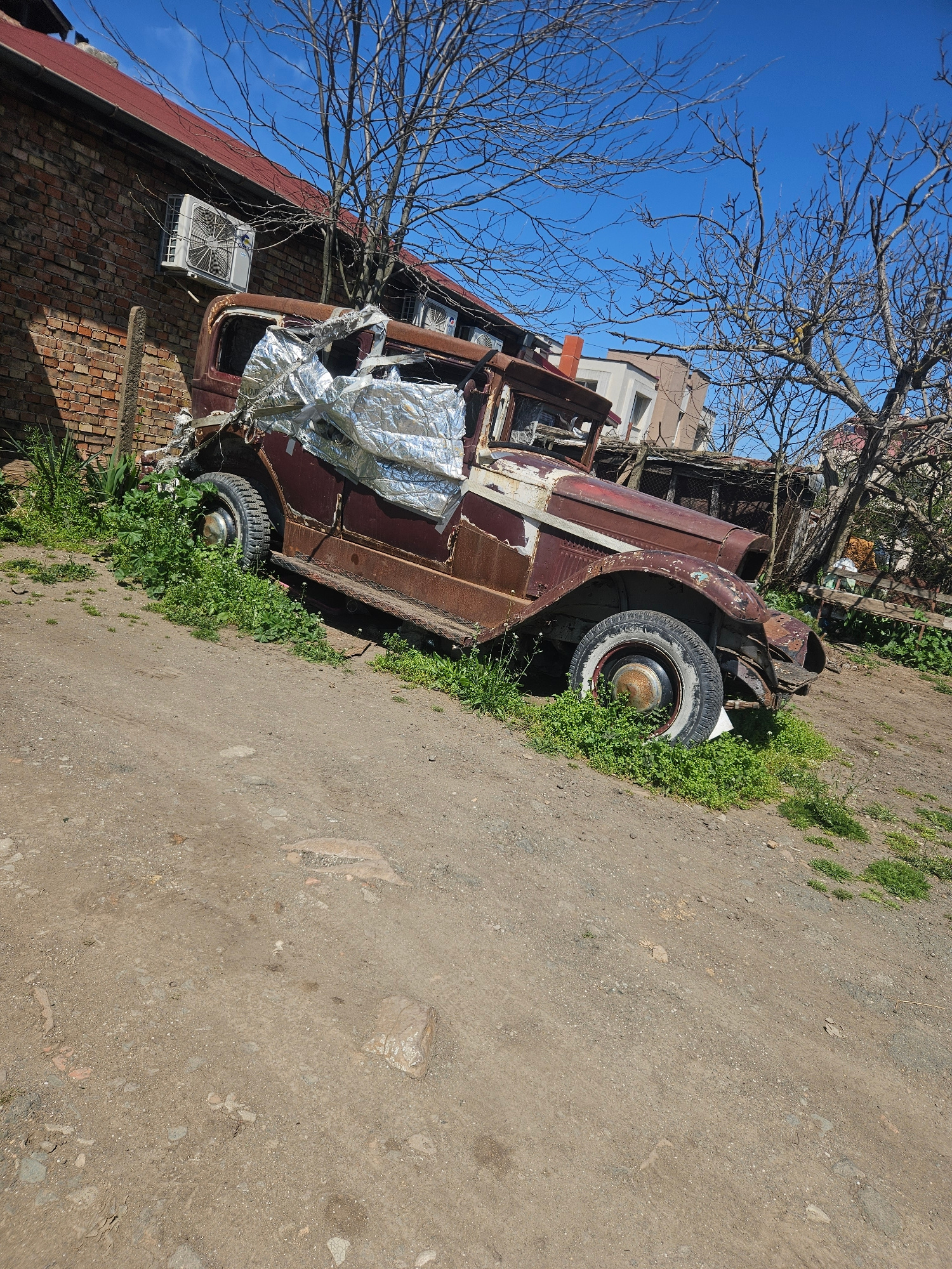 The image shows a heavily rusted and dilapidated vintage vehicle, possibly a truck, parked beside a brick wall and an unpaved road in Burgas, Bulgaria. The vehicle is heavily overgrown with greenery,…read more
