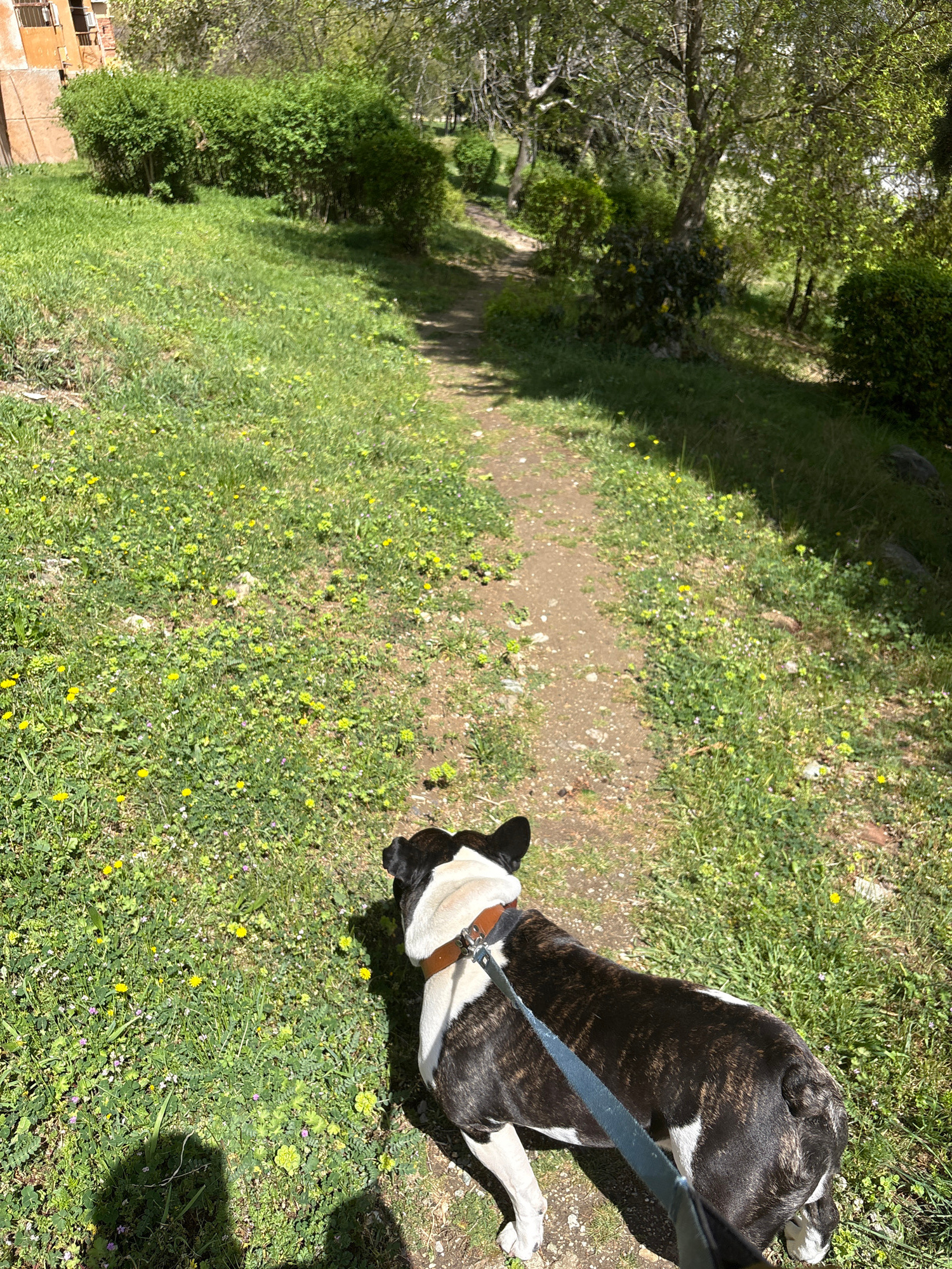 A brindle and white French Bulldog is on a leash and standing on a grassy path. The dog is facing away from the camera and towards the left. The path is bordered by green vegetation, some of which has…read more