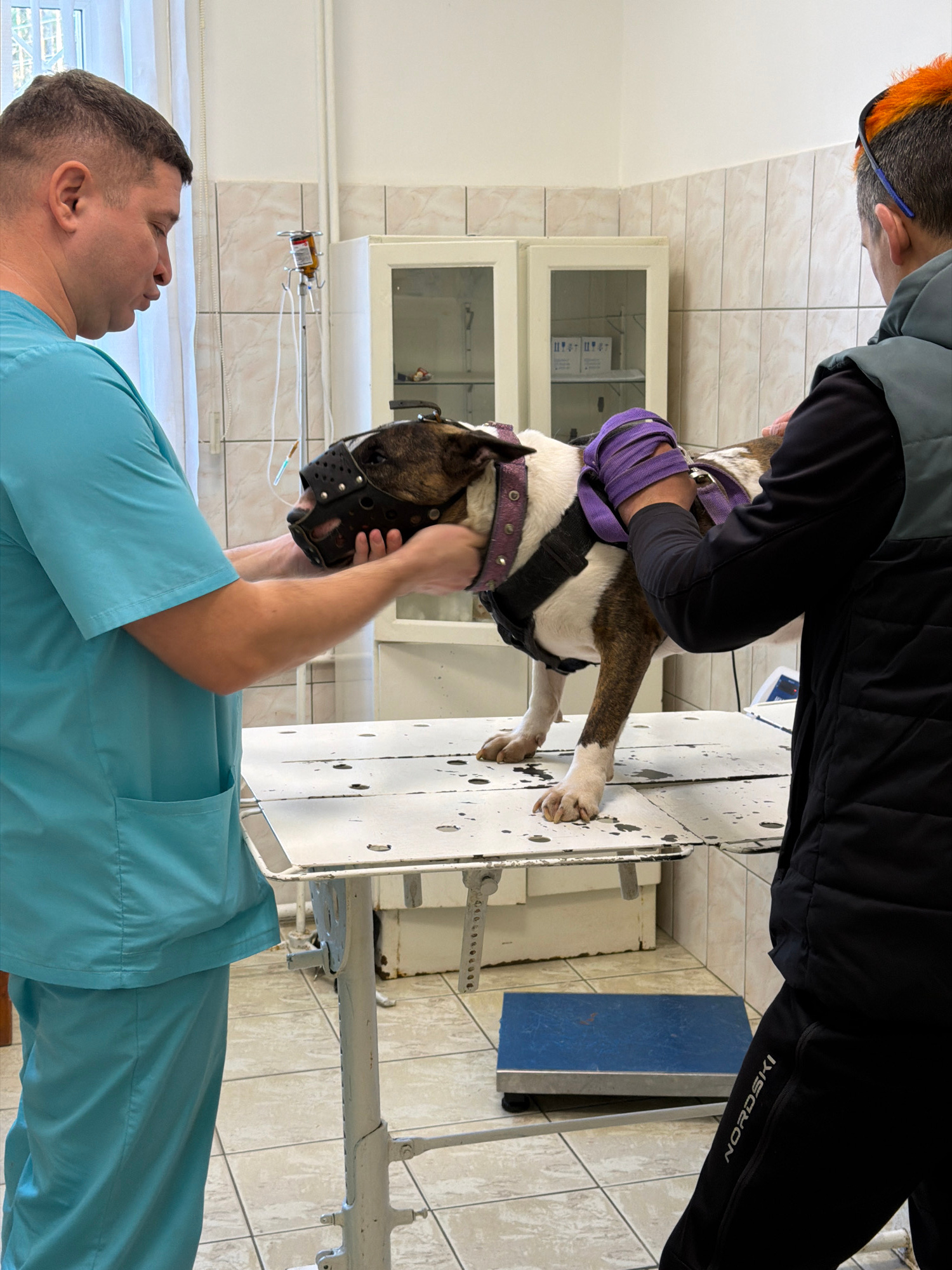 A veterinary examination room in Chaikovsky, Russia, contains a dog undergoing examination or treatment. The dog, wearing a muzzle and restraints, lies on a metal examination table. Two individuals arβ¦read more
