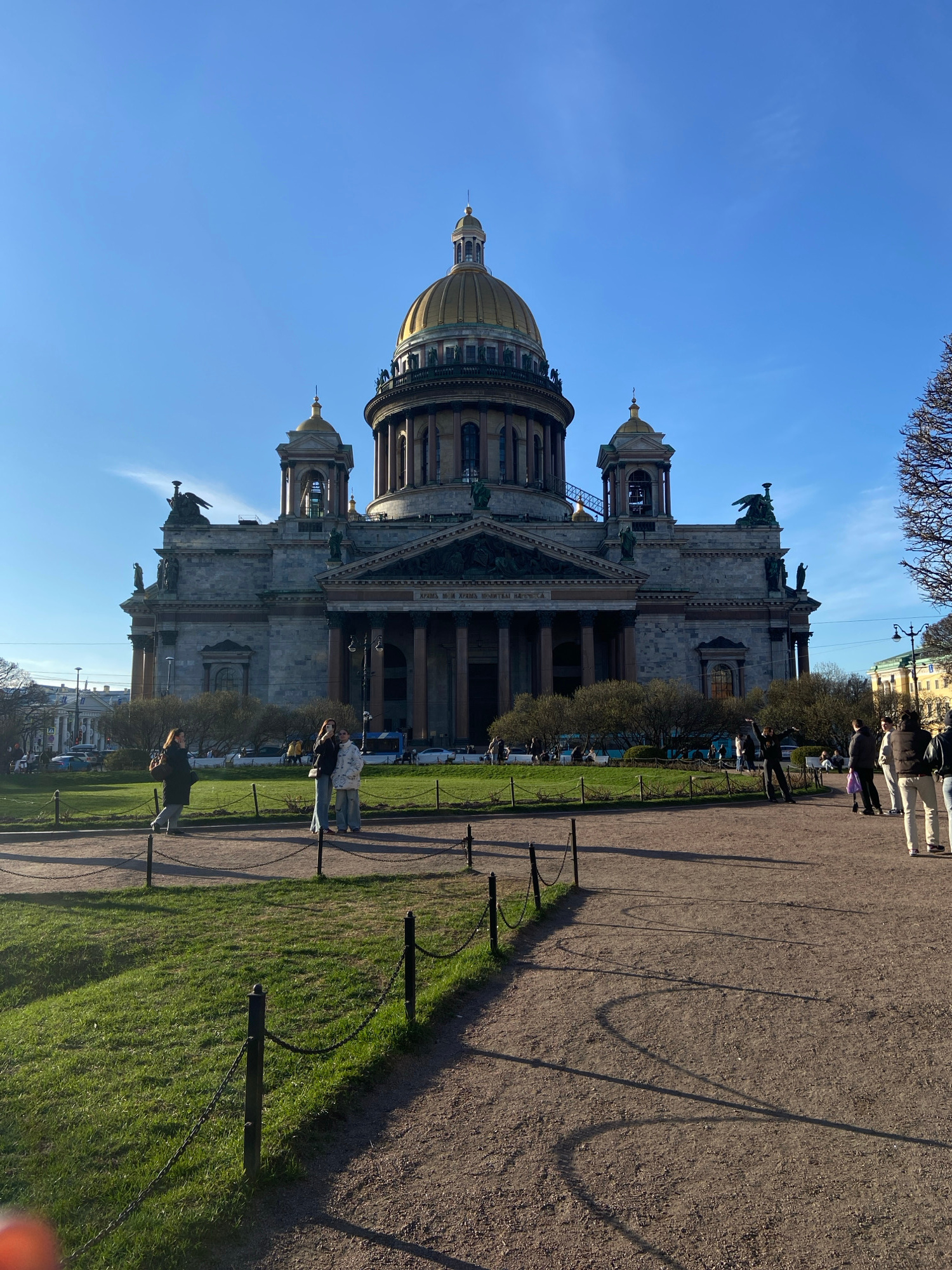 The image depicts St. Isaac's Cathedral in Saint Petersburg, Russia, from a ground-level perspective. The cathedral's architectural details, including the dome, columns, and sculptures, are visible. A…read more