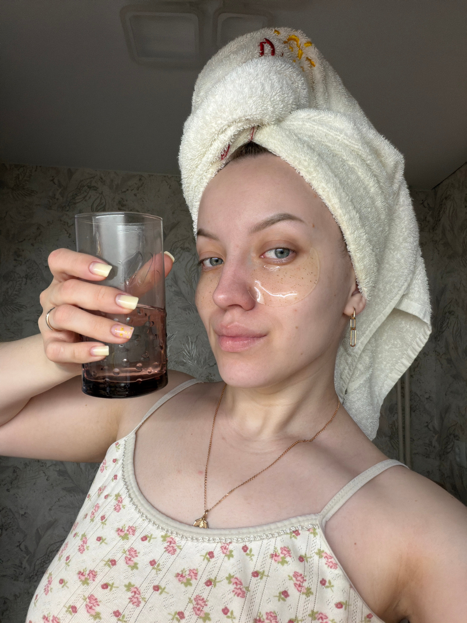 A person is holding a glass with an unknown liquid, indoors. The individual has a towel wrapped around their head, eye masks under their eyes, and is wearing a floral-patterned tank top and a gold nec…read more
