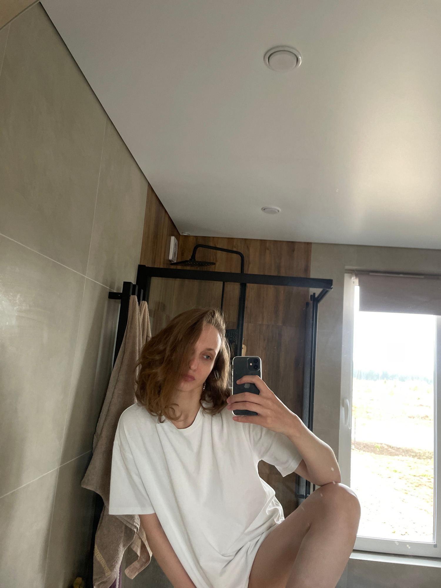A person lies on a black metal rack with beige towels in a bathroom. The person is wearing a white t-shirt and holding a black smartphone. The bathroom has light beige tile flooring and a white wall w…read more