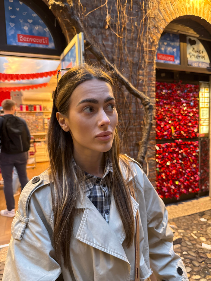 The image captures an outdoor street scene in Verona, Italy, specifically in the vicinity of Juliet's House (Casa di Giulietta). In the foreground, a female subject with long, highlighted brown hair i…read more