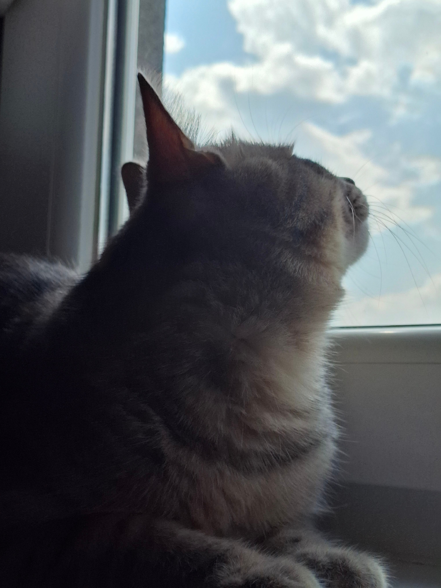 A domestic cat is depicted indoors, looking upwards and out of a window in Novi Sad, Serbia. The cat's head, predominantly gray with some lighter fur, is in the foreground, angled to reveal its sharp,…read more
