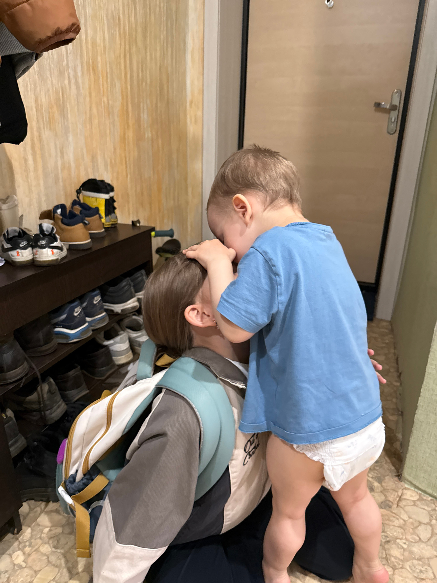 A child in a blue shirt and diaper is lying on top of an adult. The adult is wearing a jacket and sitting near a shoe rack with various shoes. The location is Rusanovo, Russia. The scene appears to be…read more