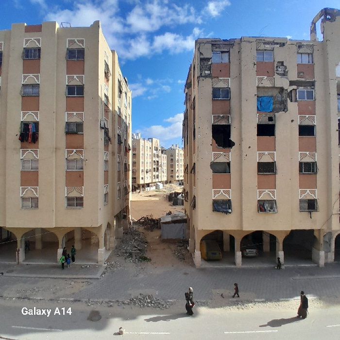 Rows of tan apartment buildings stand close together, some showing visible damage. One building has a blue tarp covering a hole. Windows appear dark or missing in several units. Debris litters the gro…read more
