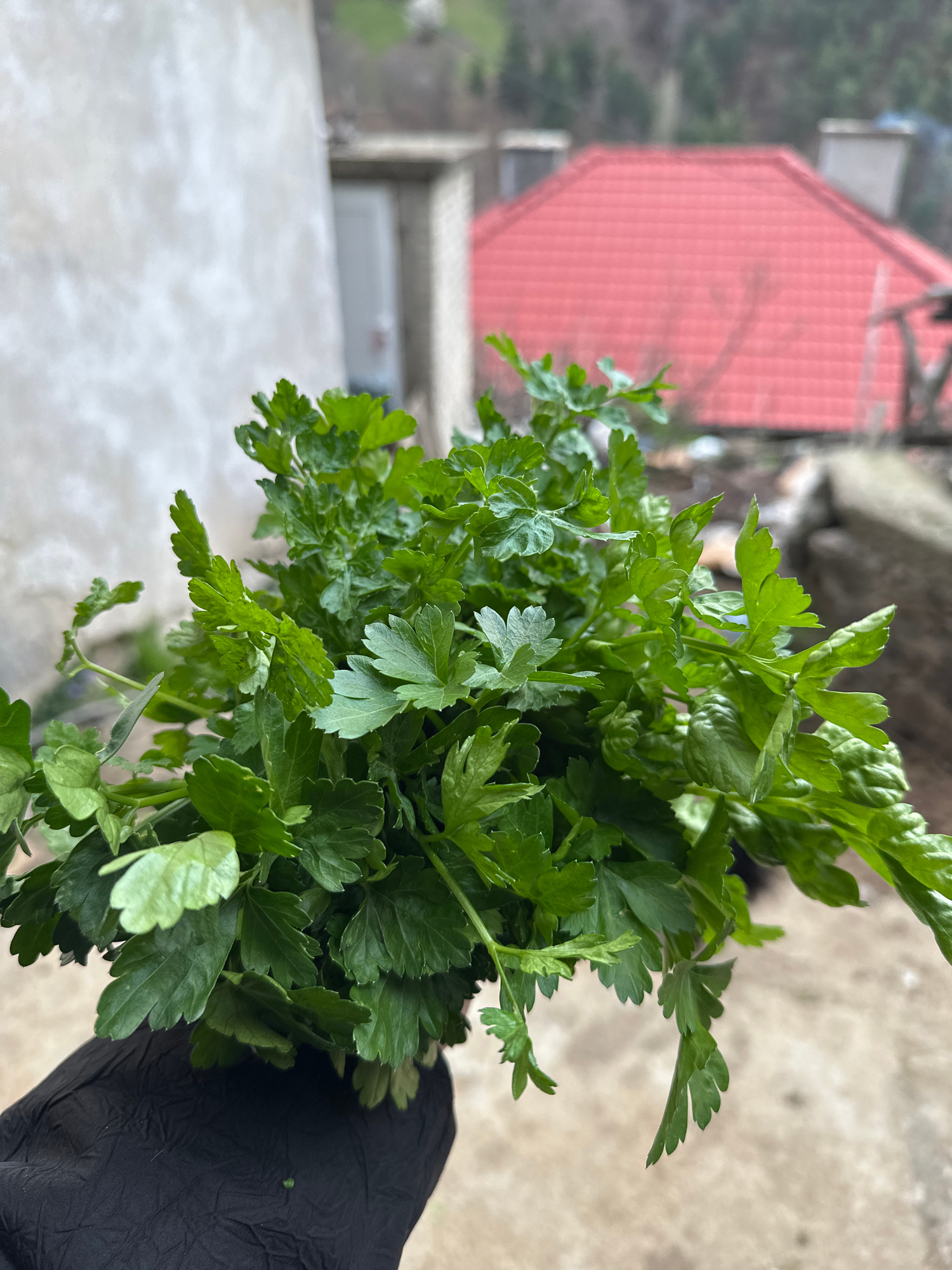 A bunch of parsley is held in someone's gloved hand. In the background is a building with a red roof. The picture was taken in the city of Pripek, Bulgaria.
