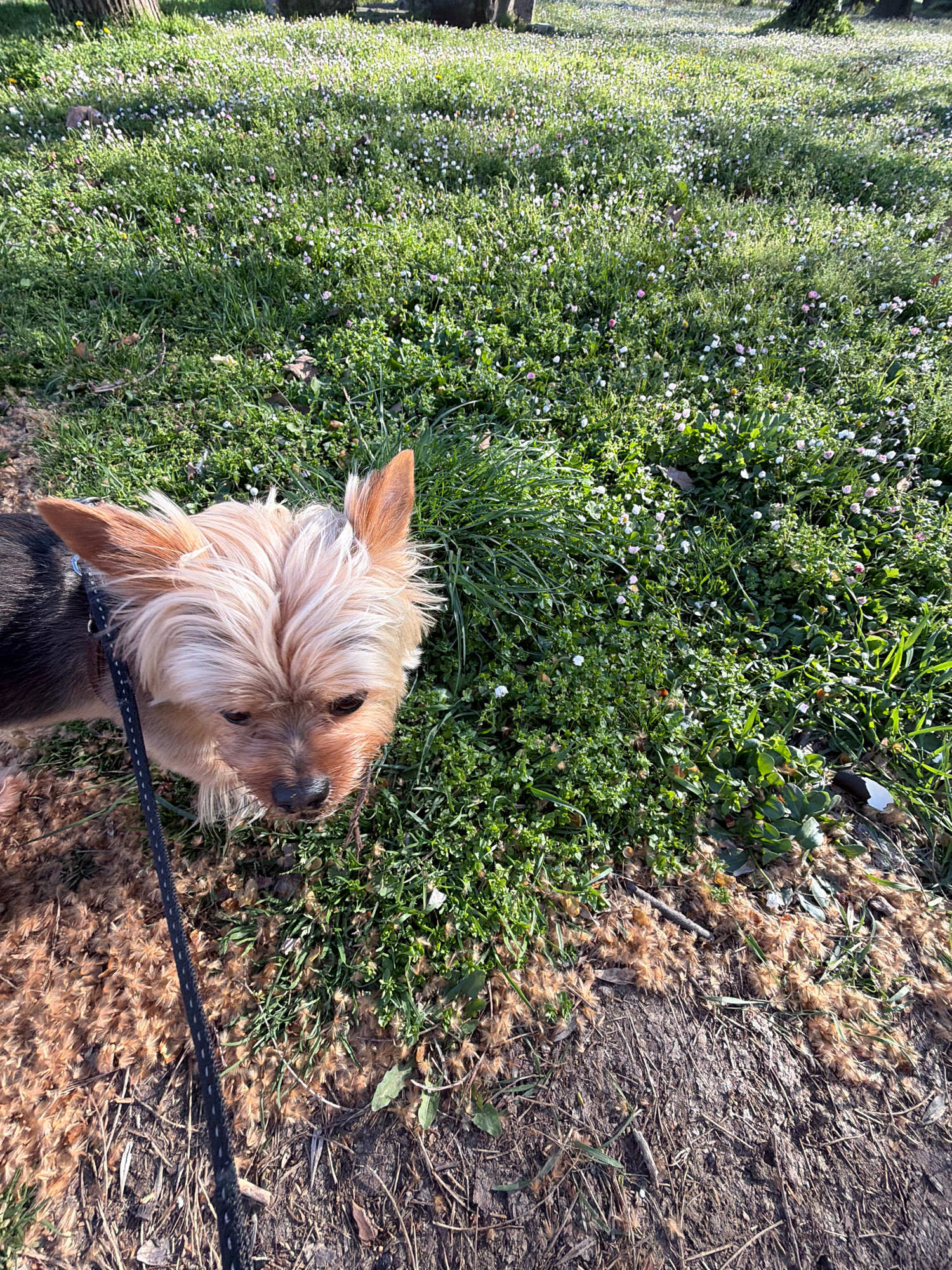 A tan and black Yorkie dog on a leash is standing on grass and dirt in a park. The grass has small white flowers growing among it. The background is green with small trees. The location is unspecified…read more