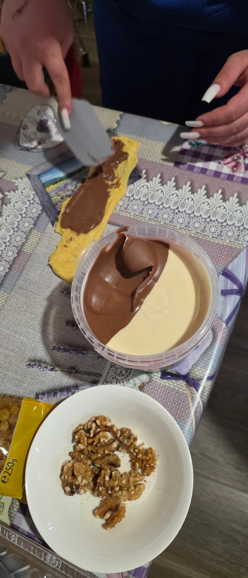 The image shows a partially assembled dessert on a patterned tablecloth, likely indoors. A person's hands are visible; one is holding a spatula and spreading chocolate-hazelnut spread onto a yellow pa…read more