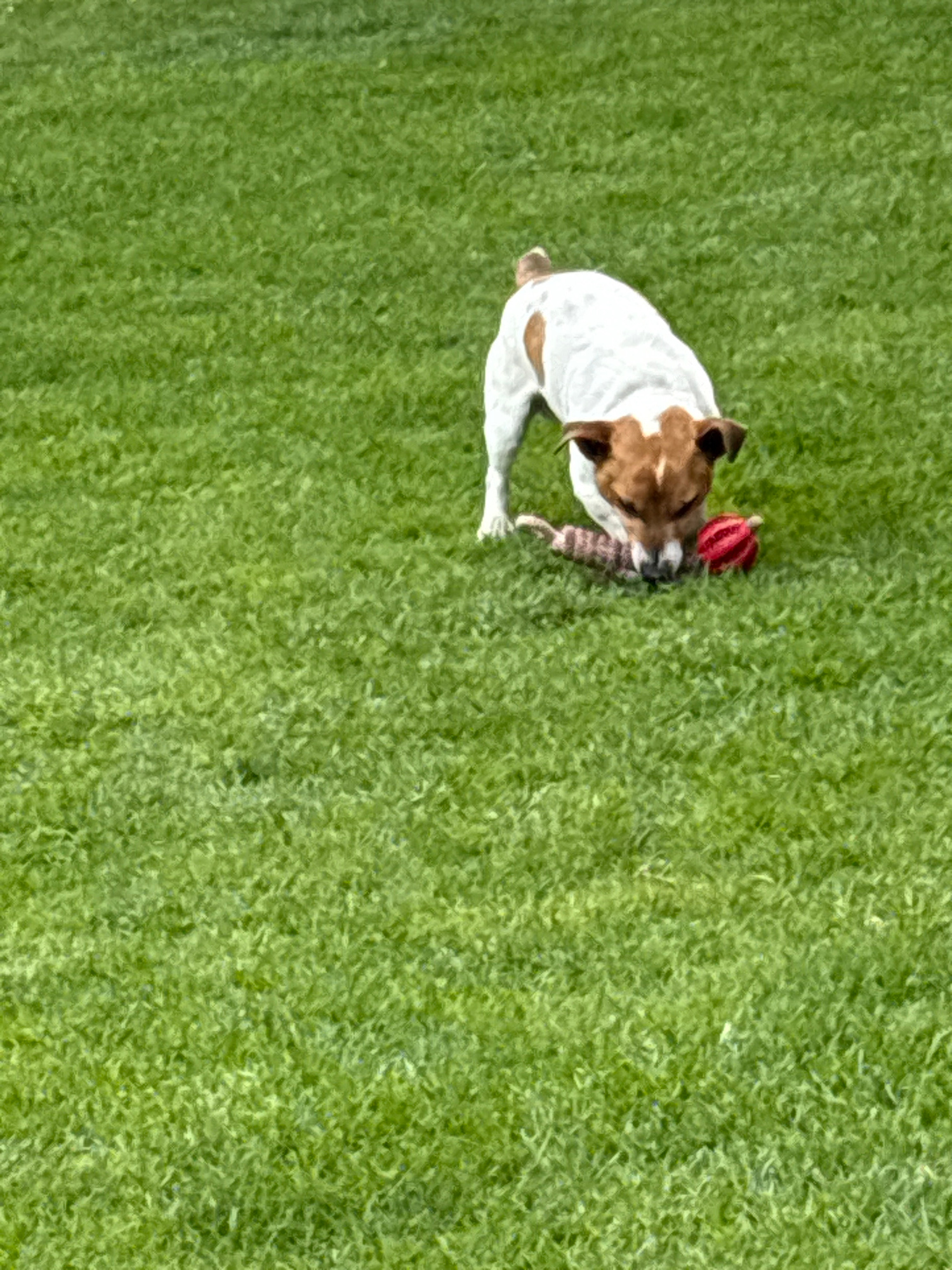 A white and brown dog is on a green lawn holding a red object and a gray object in its mouth. The location is in the city of Unknown, Unknown.