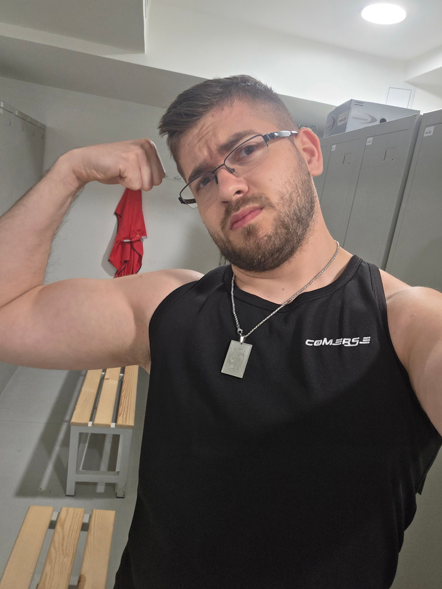 An indoor, rotated full-length portrait shot captures a young man posing in what appears to be a gym locker room or changing facility. The image is rotated approximately 90 degrees counter-clockwise f…read more