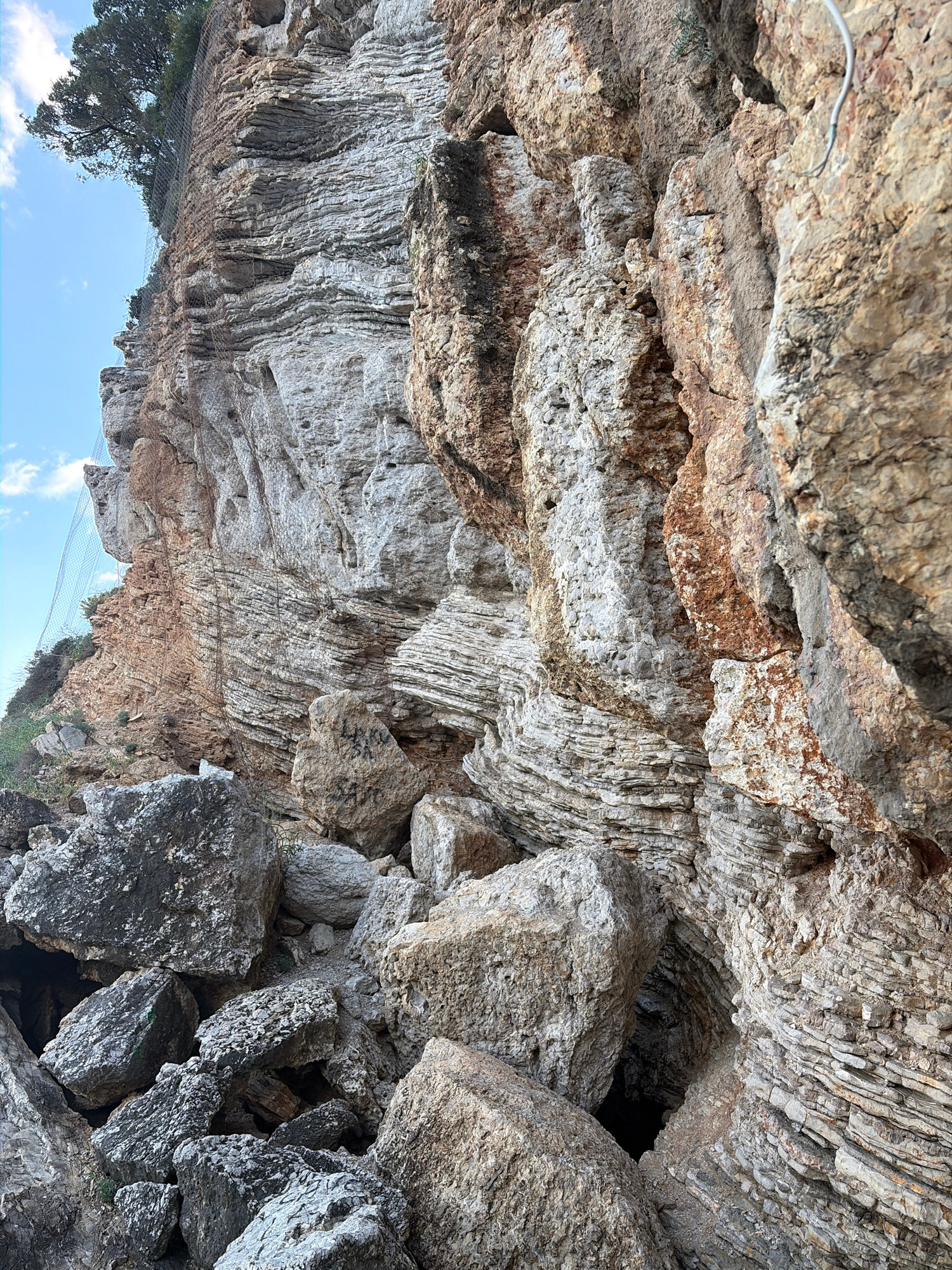 The image depicts a rock formation in Budva, Montenegro, oriented vertically. The sky with some clouds is visible at the bottom. A single tree and foliage are on the left side. A protective net is vis…read more