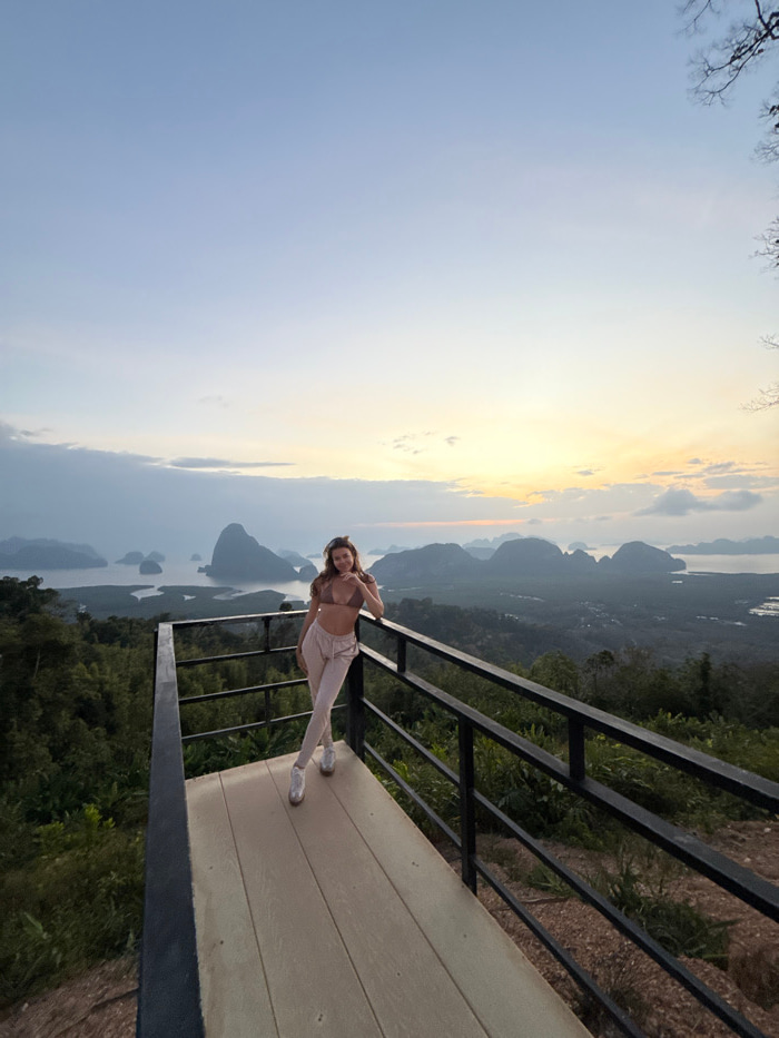 A woman stands on a wooden platform with a black railing, posing against a scenic backdrop. The view encompasses a landscape of islands and water stretching to the horizon, with a soft, gradient sky t…read more