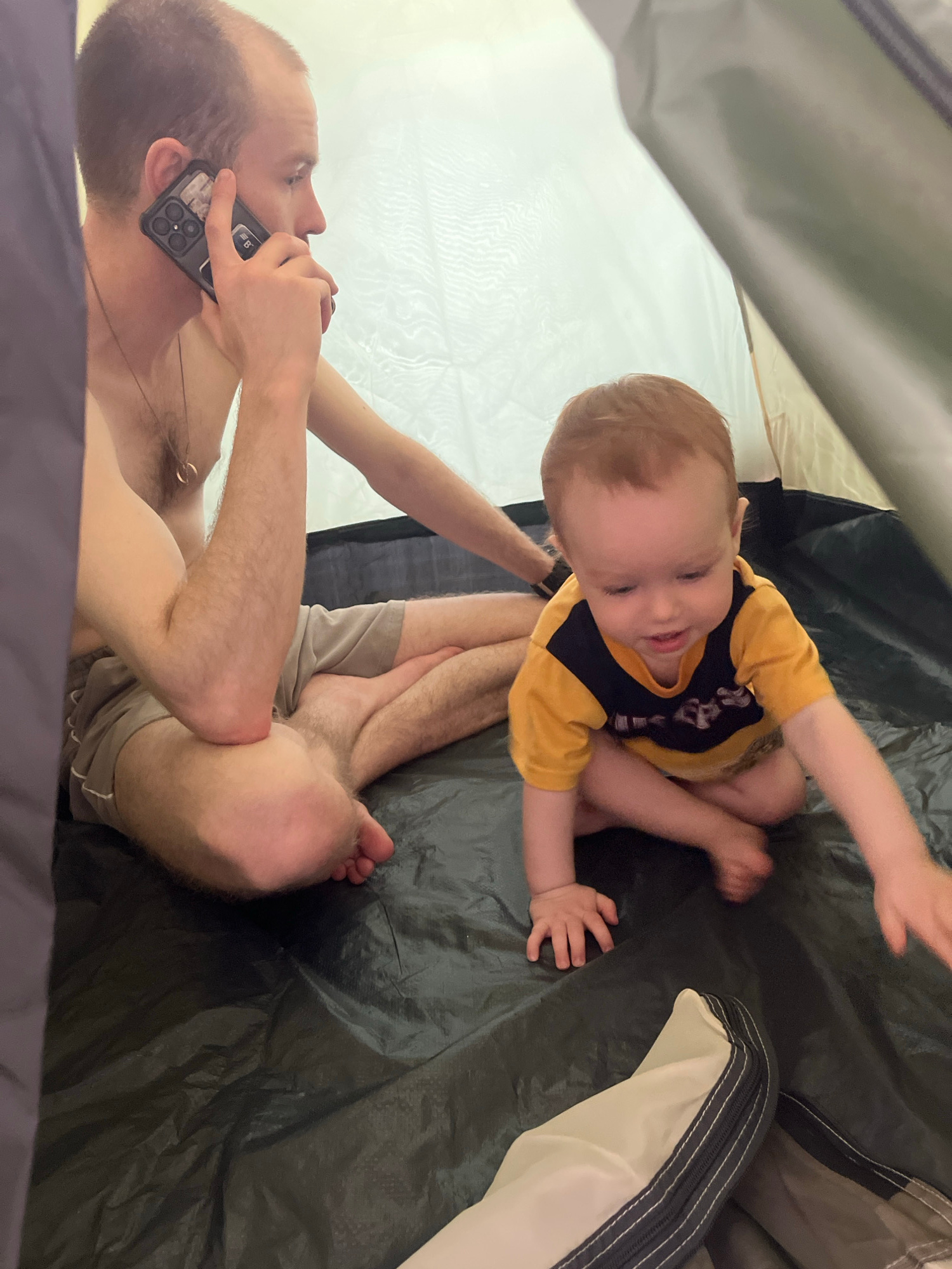 A man is lying on his back inside a tent, talking on a smartphone held to his left ear. He has short hair, pale skin, and is shirtless. A gold necklace is visible around his neck. He is wearing beige…read more