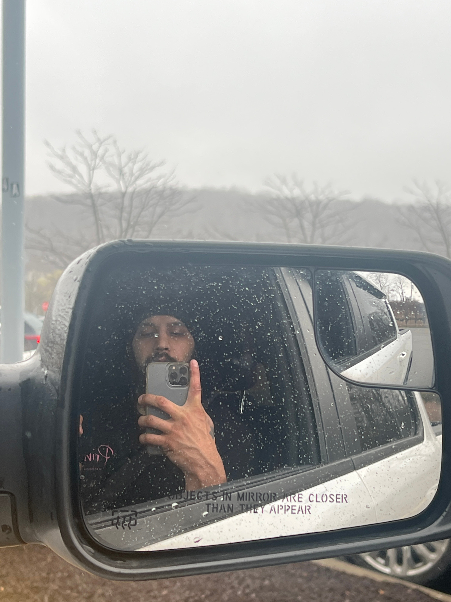 The image shows a side mirror of a vehicle, likely a truck or van, on a rainy day. The mirror reflects the face of a person holding a smartphone taking a selfie. The reflection also includes parts of…read more