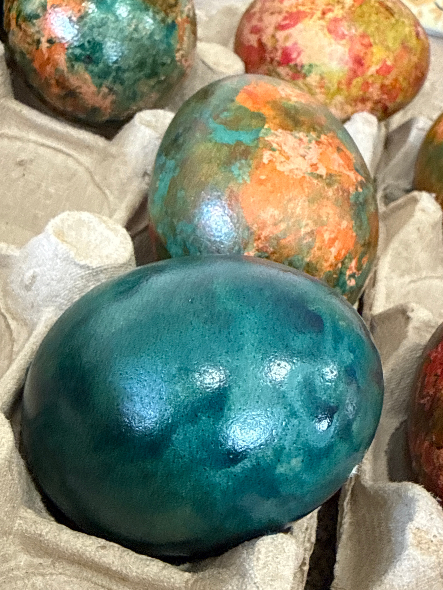 A close-up shot shows a cardboard egg carton containing several decorated Easter eggs. The eggs have mottled surfaces with shades of blue, green, orange, and yellow. The blue egg is most prominent andβ¦read more