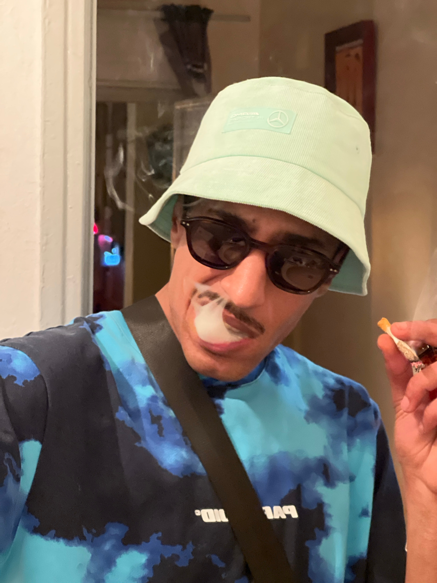 A person wearing a light green bucket hat, sunglasses, and a blue and black tie-dye shirt is smoking a cigarette. The person has what appears to be drawn-on eyebrows and a mustache. Smoke is emanating…read more
