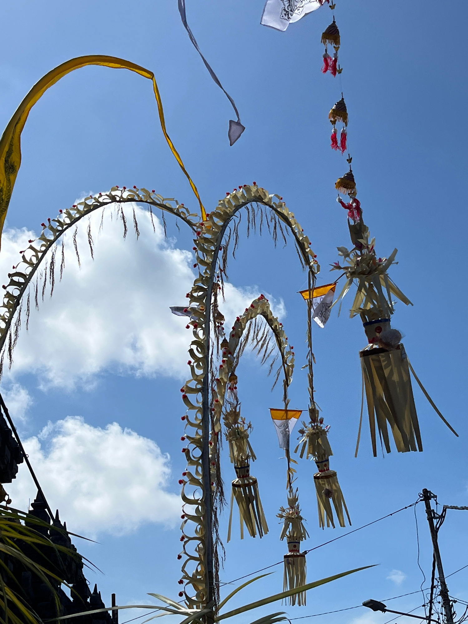 A low-angle shot shows an ornate arrangement of decorations hanging in the air, presumably above a street. The decorations are made of organic materials like bamboo or palm leaves, fashioned into curv…read more