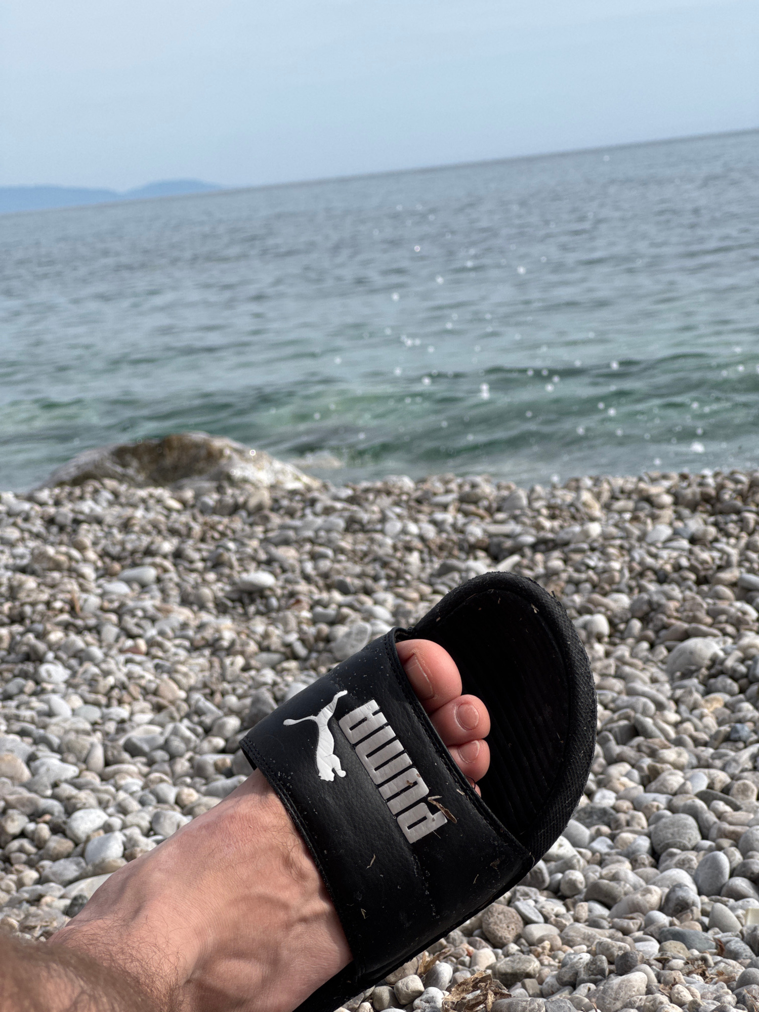 The image shows a person's foot wearing a black Puma slide sandal on a pebble beach in Prijevor, Montenegro. The edge of the water is visible to the left, and the sky is hazy in the upper left. The be…read more