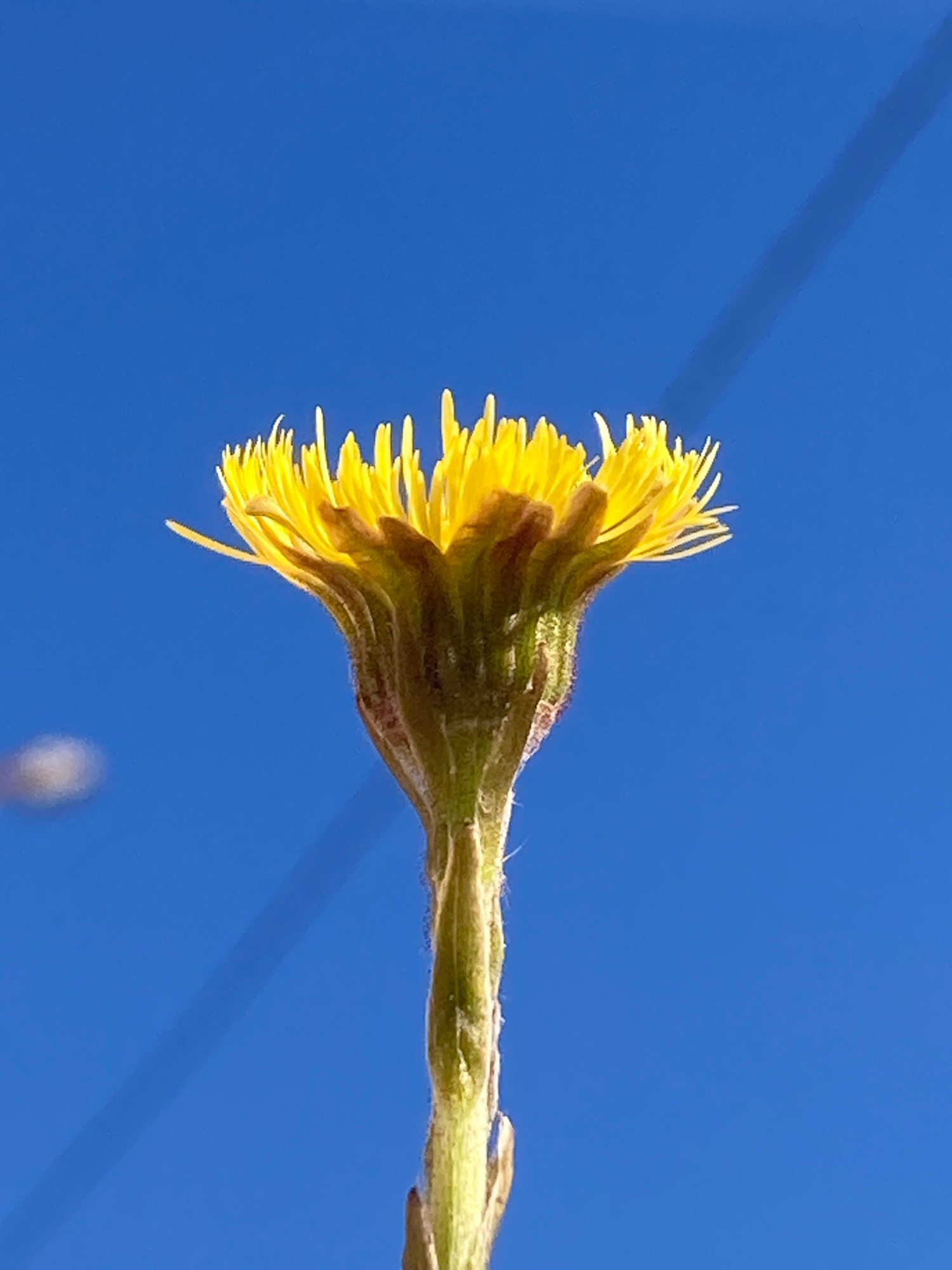 A vibrant yellow flower, likely a type of dandelion or colt's foot, is captured in a close-up shot against a clear, brilliant blue sky. The flower is oriented horizontally, with its full bloom positio…read more