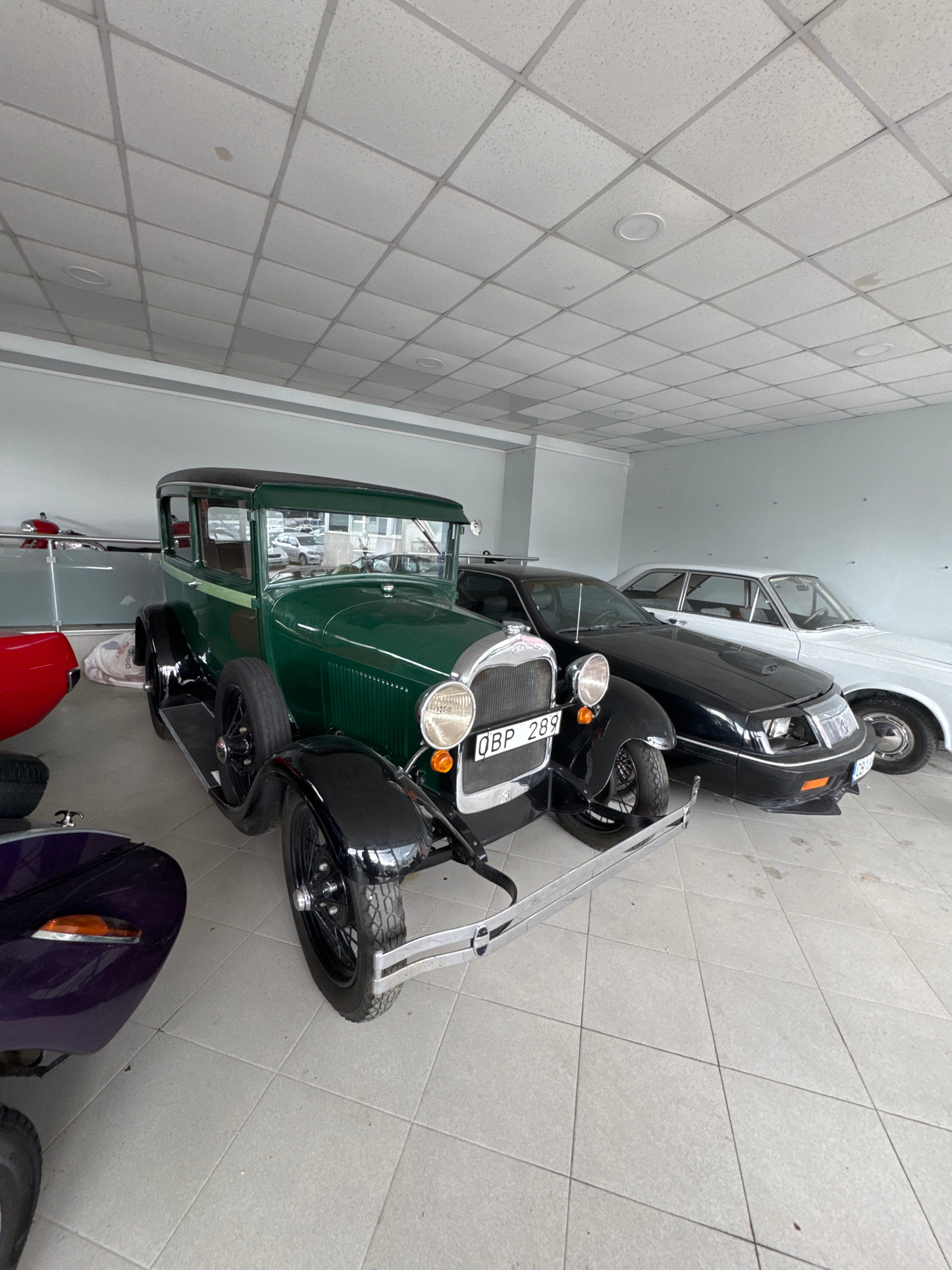 The image shows the interior of what appears to be a vintage car museum or a private collection in an enclosed space with tile flooring. The space is well-lit. The dominant feature is a collection ofโฆread more
