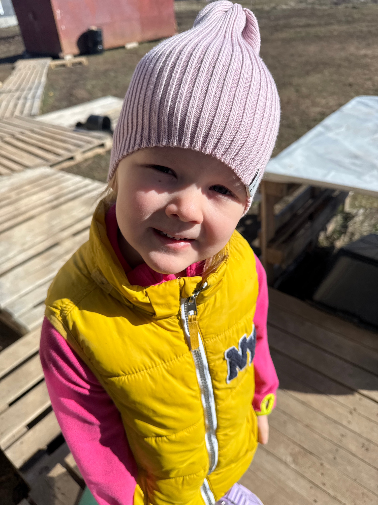 A young child, likely a toddler, is the central subject of the image. The child is wearing a pink knit hat and a yellow puffer vest over a pink long-sleeved shirt. The vest has a zipper and a patch on…read more
