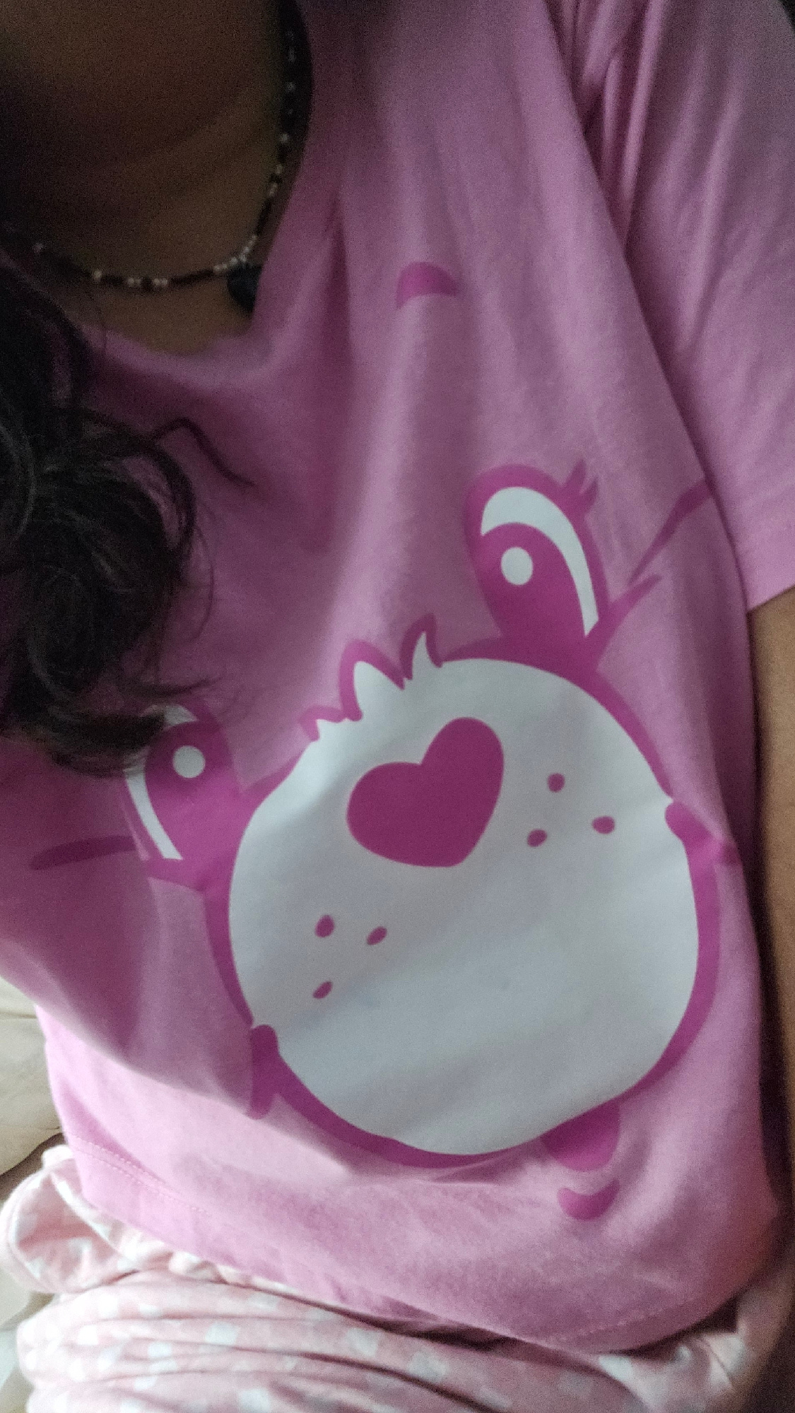 A close-up shot captures a person wearing a light pink t-shirt adorned with a white and darker pink stylized cartoon crab design, featuring a heart shape on the crab's body. The subject is also wearin…read more