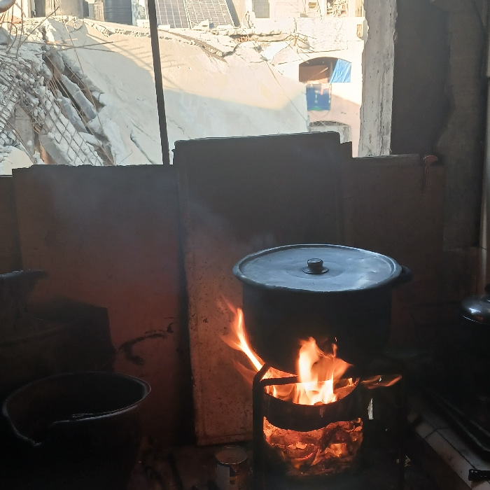 The image displays an indoor scene in the city of Gaza, Palestinian Territory, with an outdoor background visible through an opening. In the immediate foreground, a dark metal cooking pot with a lid s…read more
